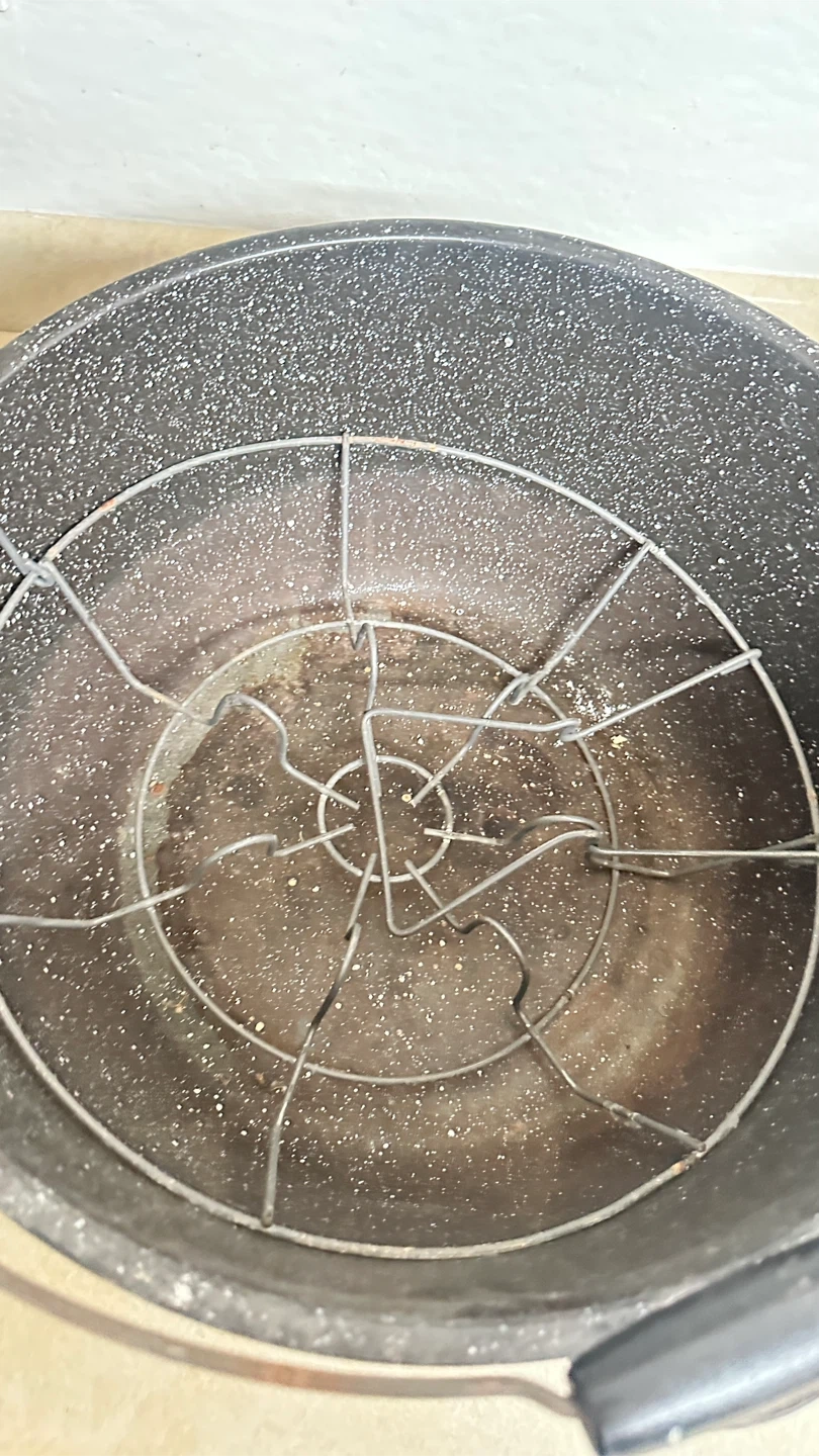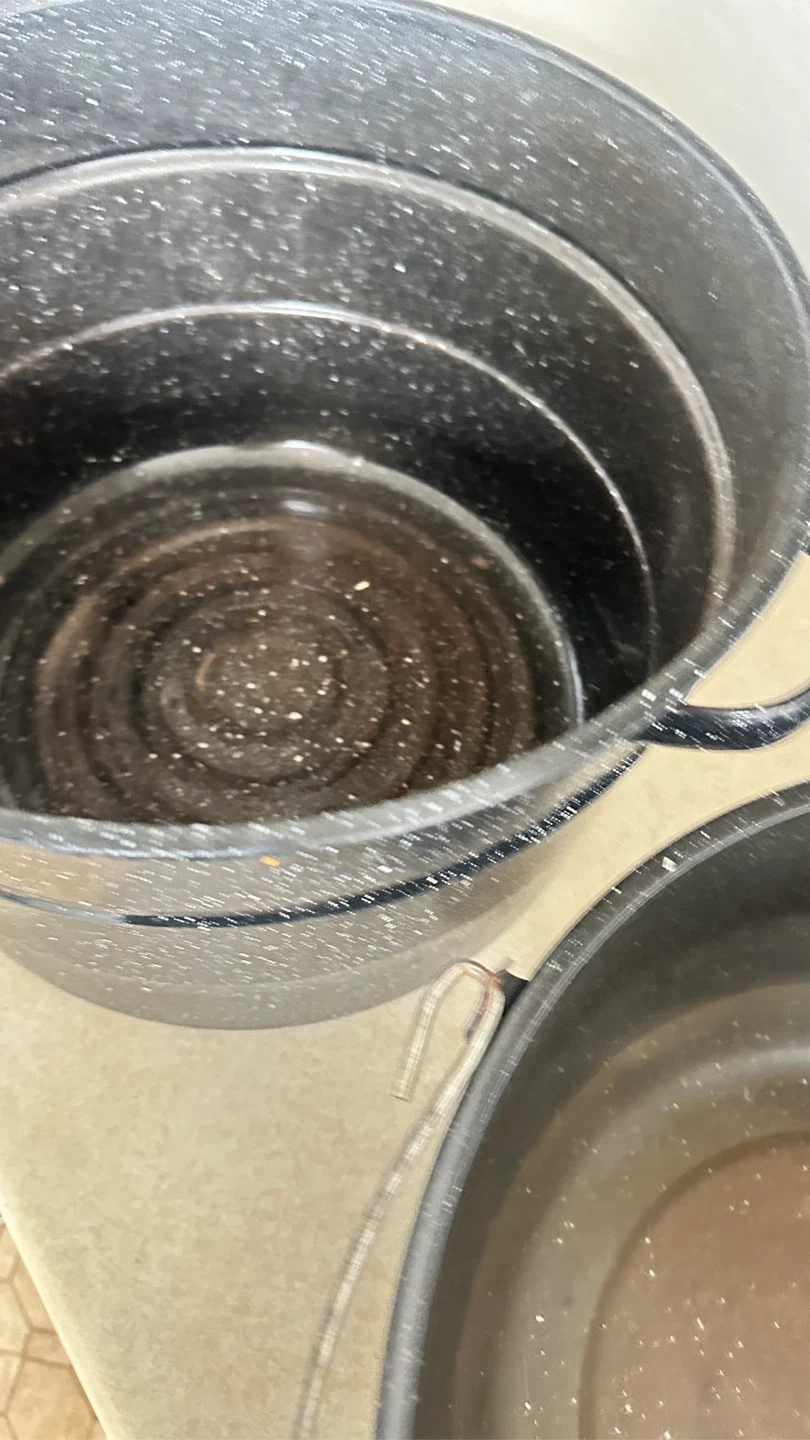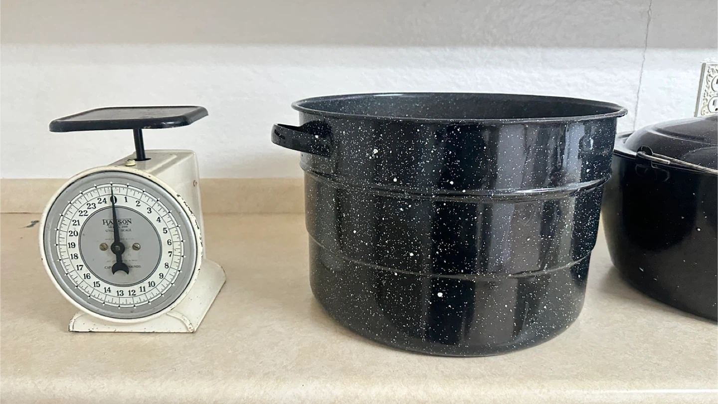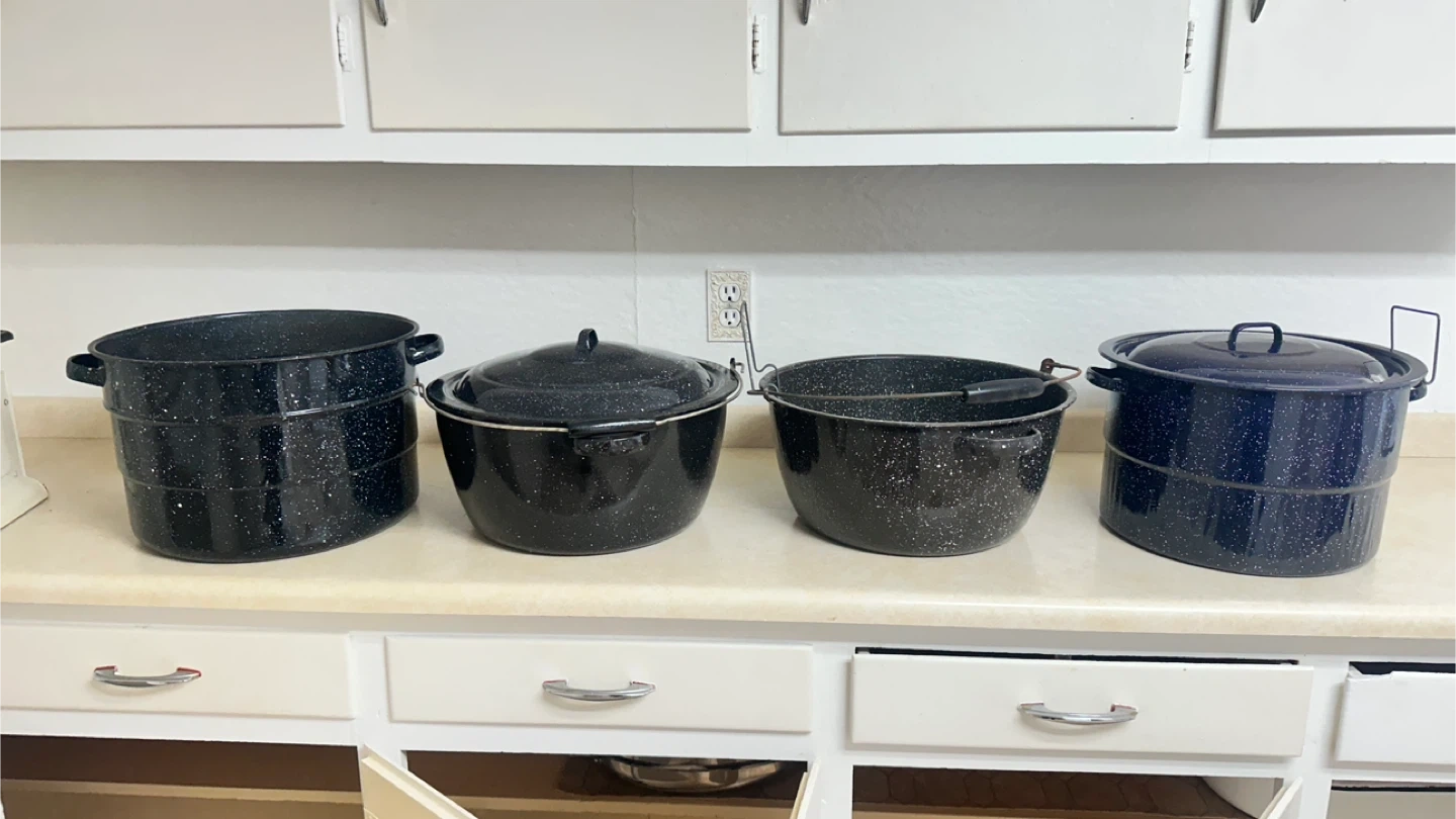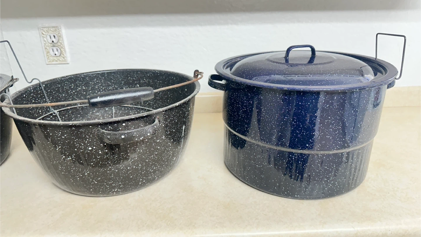Includes a 22-quart canning pot with rack, a 10-quart steamer pot, and a 12-quart Granite Ware pot. These enamel-on-steel pots are great for canning, steaming, or large batch cooking. Exterior enamel has a speckled speckled blue and black pattern.