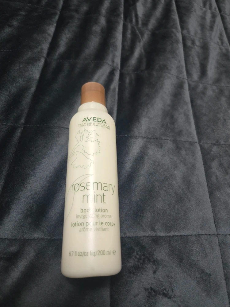 Selling a bottle of Aveda Rosemary Mint body lotion. It contains 6.7 fl oz/oz liq/200 ml. It has an invigorating aroma and is perfect for moisturizing your skin!
