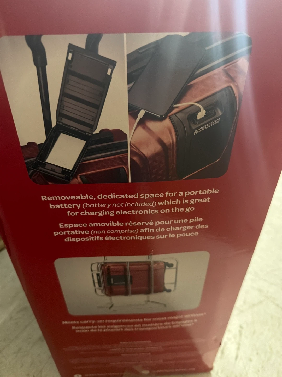 This American Tourister set includes two spinner carry-on sized pieces. It features a removable, dedicated space for a portable battery to charge electronics on the go. Fits carry-on requirements for most airlines.