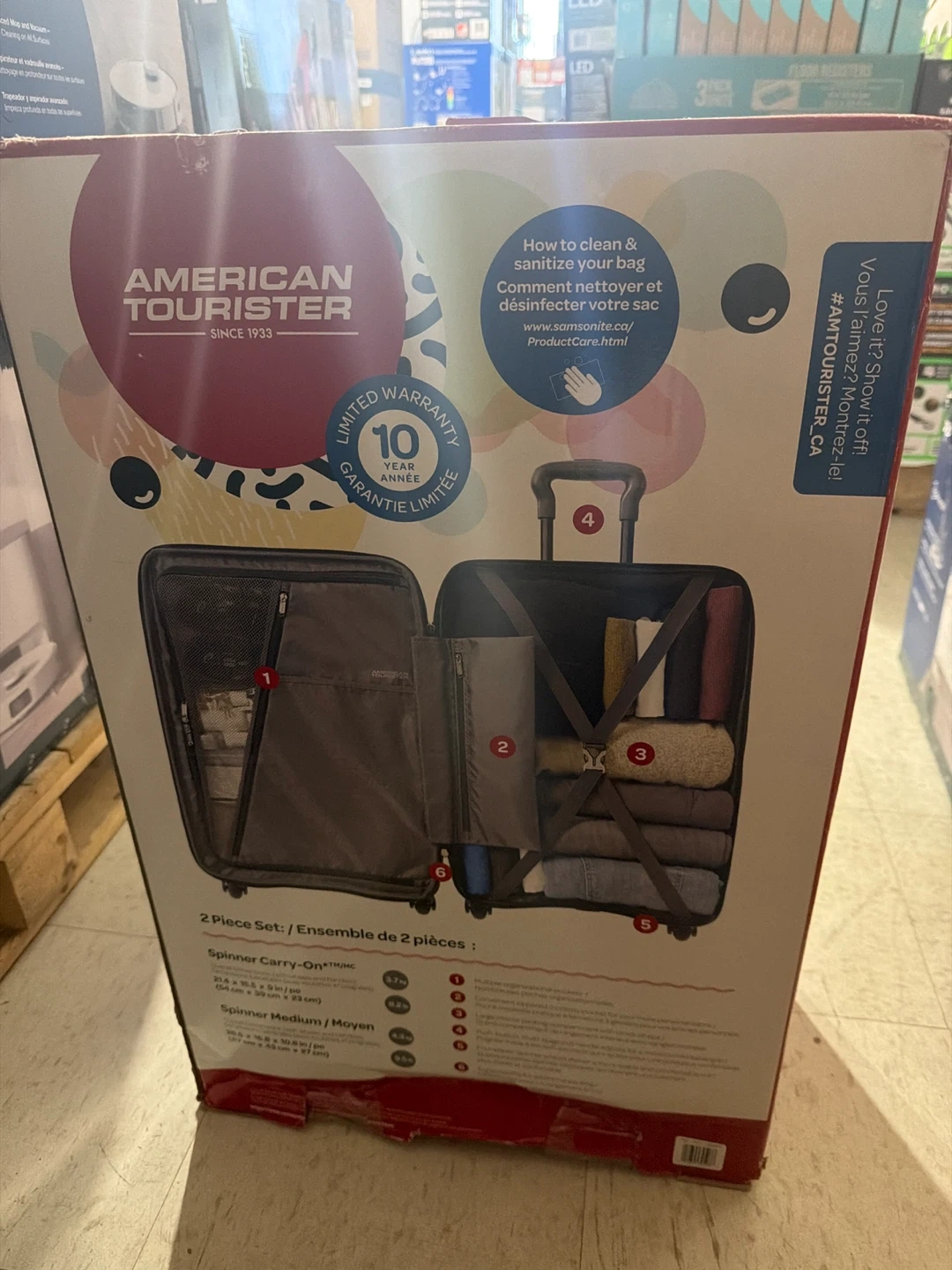 This American Tourister set includes two spinner carry-on sized pieces. It features a removable, dedicated space for a portable battery to charge electronics on the go. Fits carry-on requirements for most airlines.