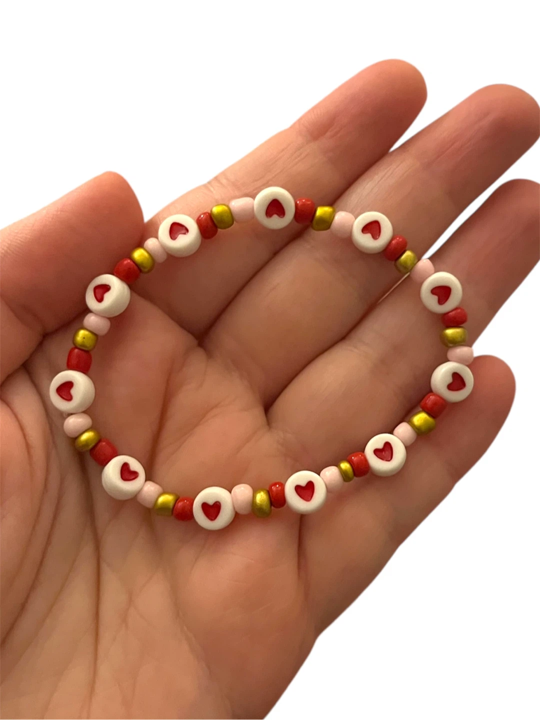 Here's a cute beaded bracelet featuring heart details! It's made with red, white, pink, and gold beads. Perfect for adding a little love to your outfit