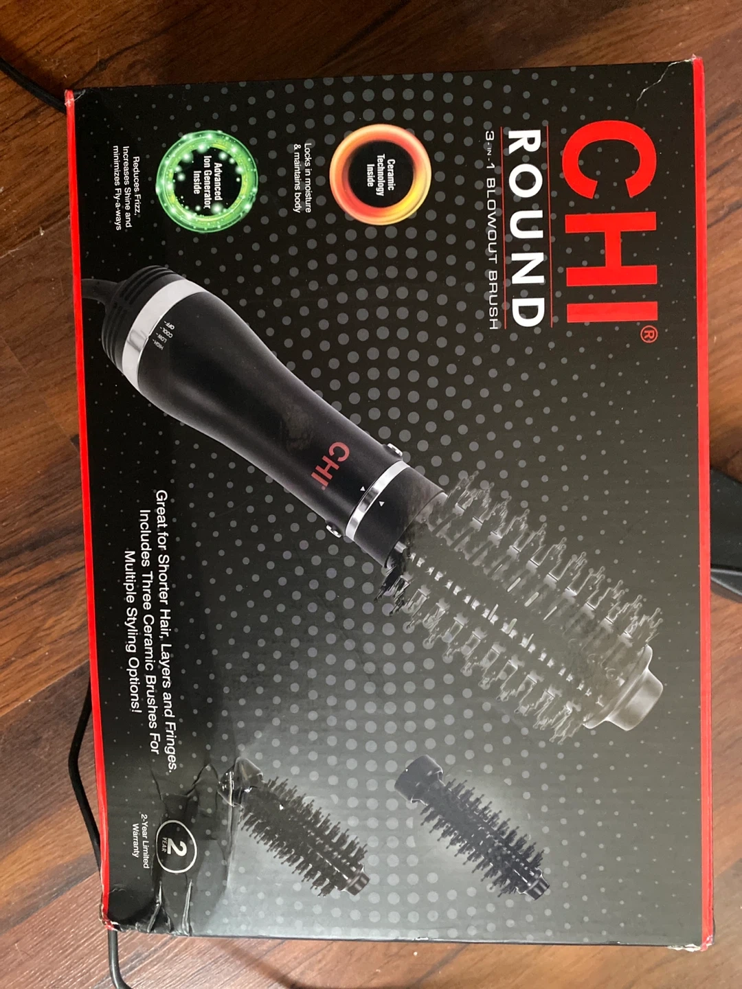 This CHI Round 3-in-1 blowout brush features 1000 W DC motor and ceramic technology combined with ion technology. It includes three attachments for unlimited styling options. Swivel and tangle free 7 ft cord.