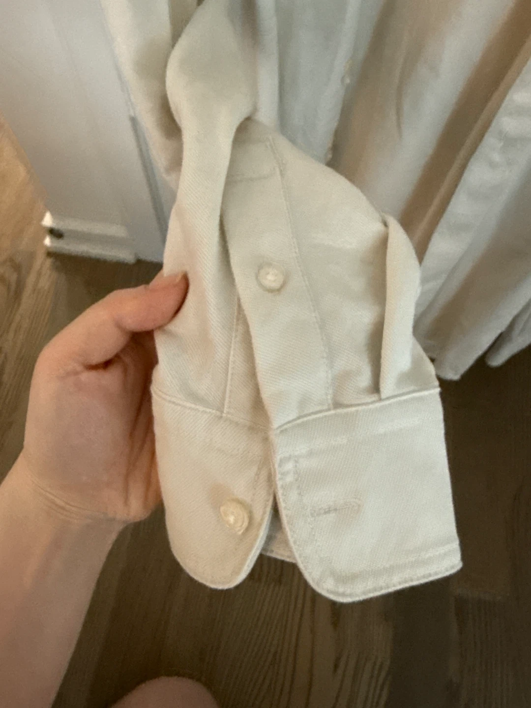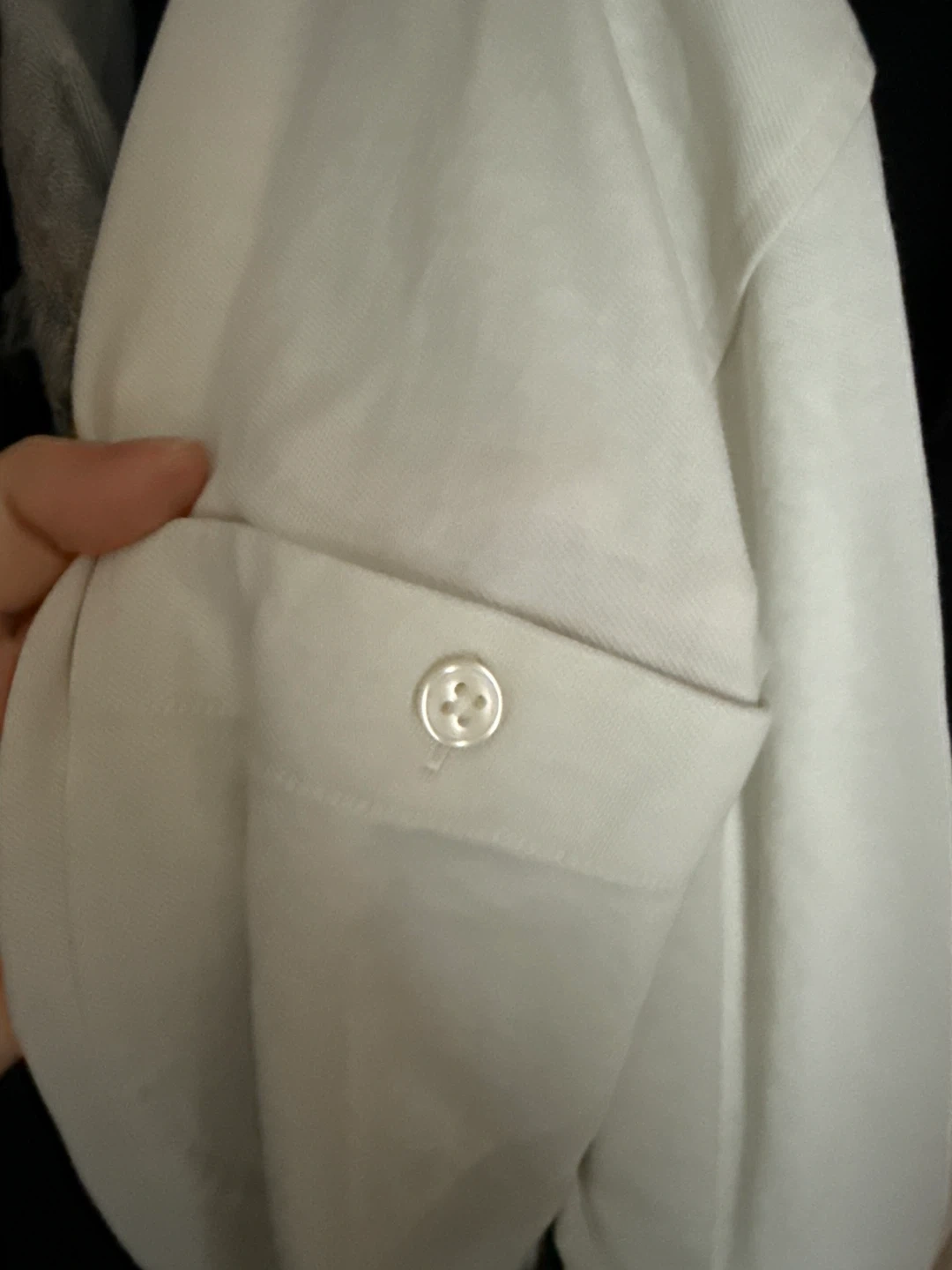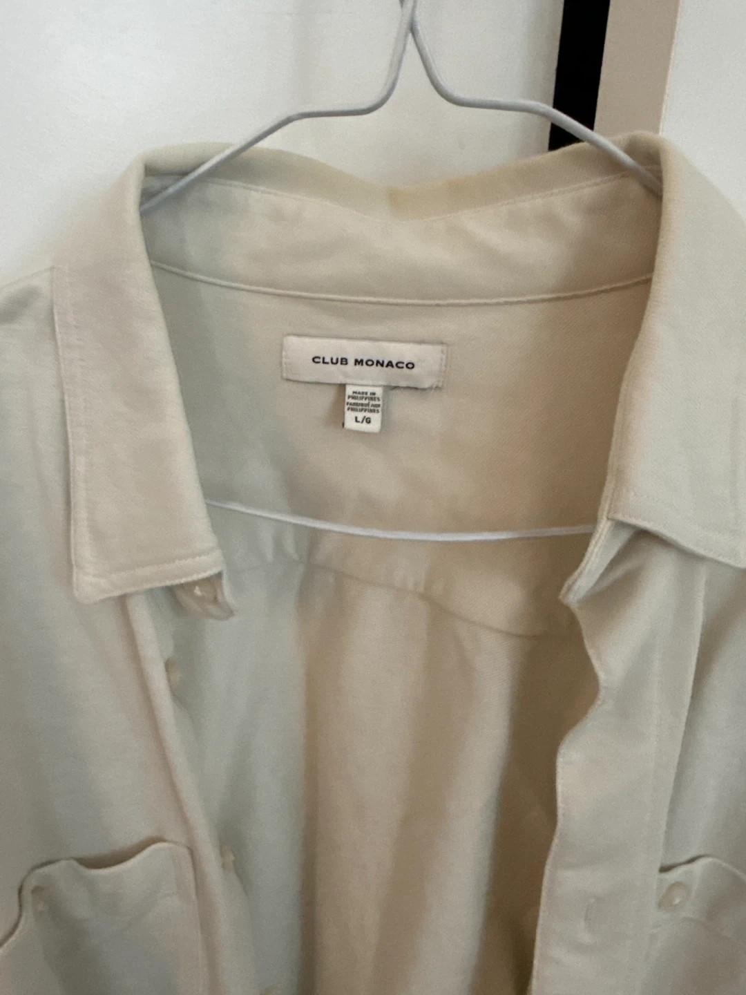 This is a long-sleeved button-up shirt from Club Monaco. It features two chest pockets and a classic collar. The size is L/G.