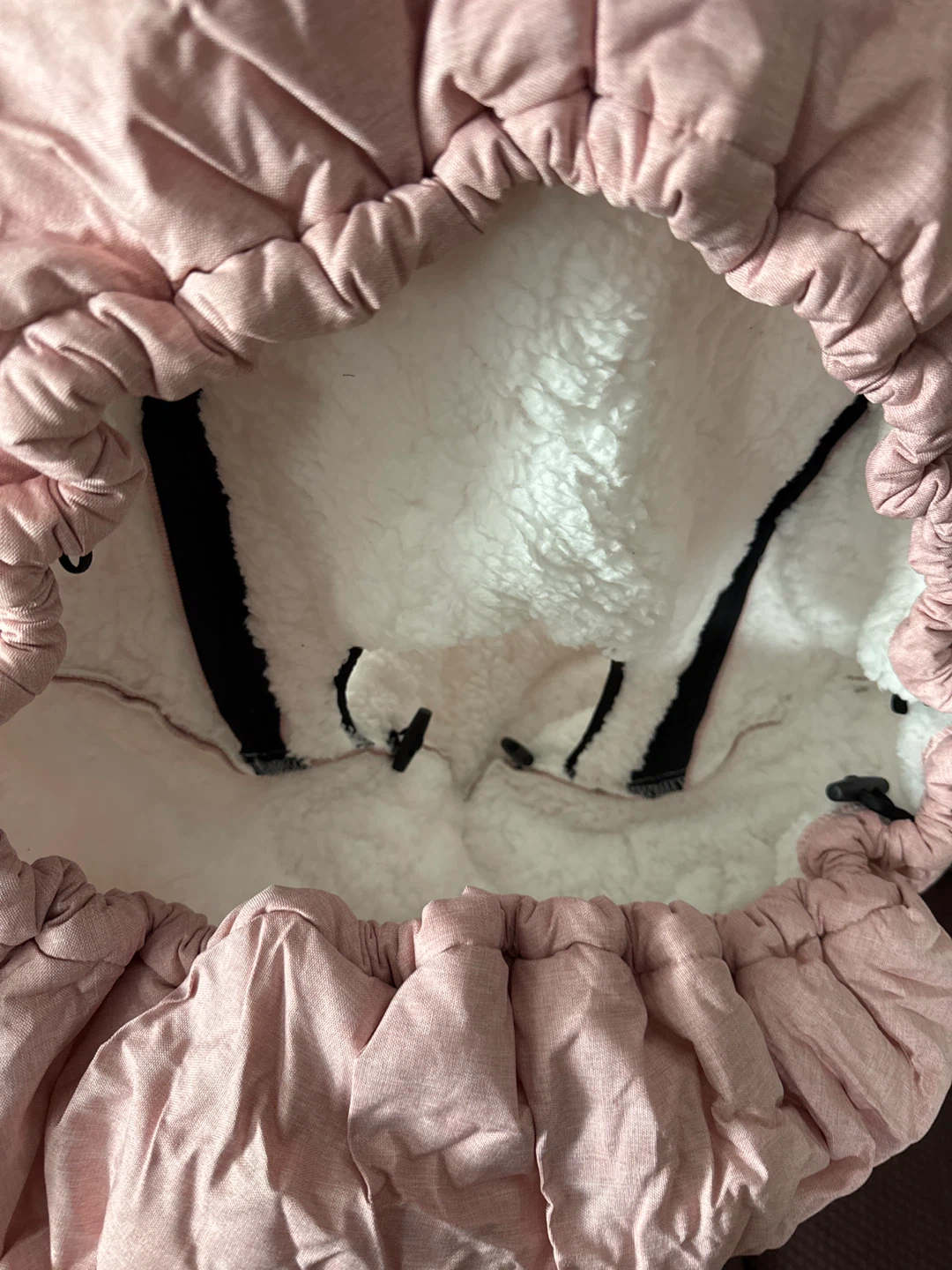 This is The Kenkyo baby car seat cover. It features a soft, sherpa-lined interior. This cover is suitable for keeping your little one cozy during car rides. Never used