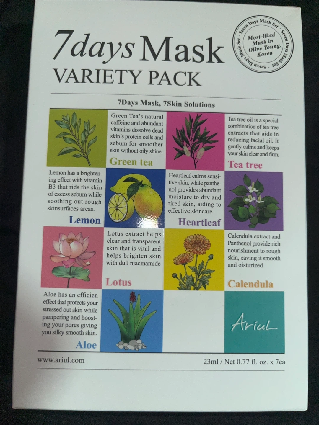 Ariul 7days Mask variety pack features seven masks for different skincare needs. Masks include Green Tea, Tea Tree, Lemon, Heartleaf, Lotus, Calendula, and Aloe. Each mask is 23ml, for a total of 7 masks.