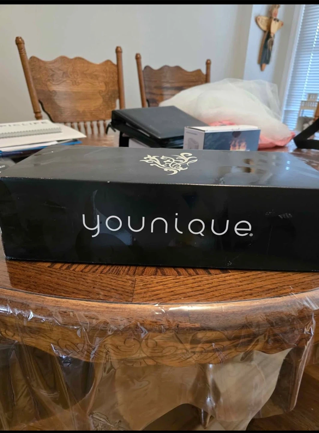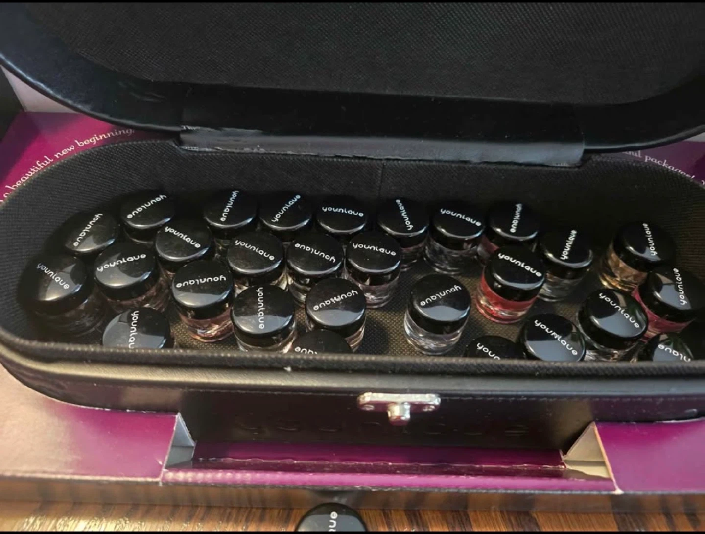 This is a Younique makeup collection featuring multiple eyeshadow palettes housed in a black faux-leather case. The case has embossed detailing and a metal clasp closure. It comes with a variety of vibrant colours. This collection is great for experimenting with different looks!