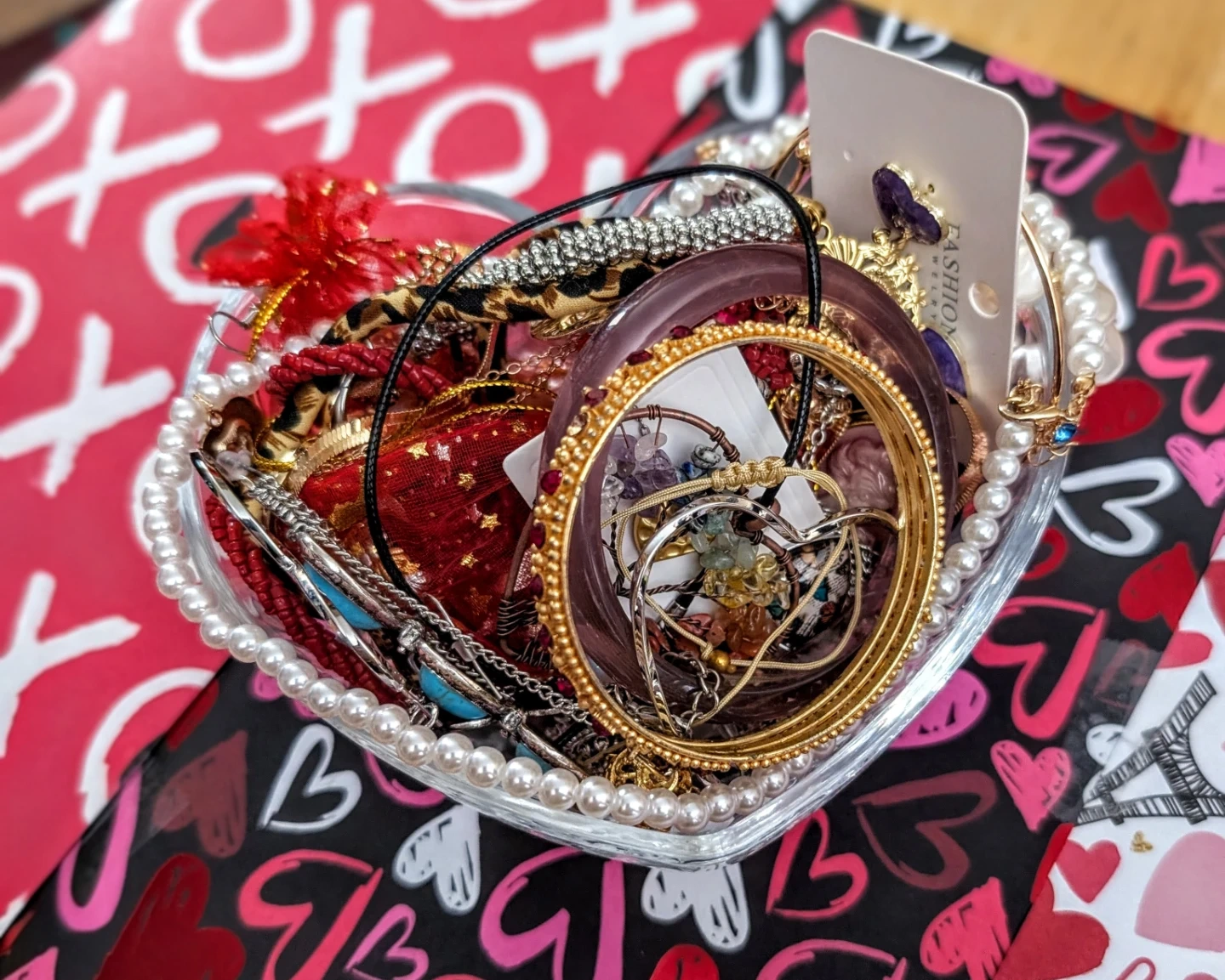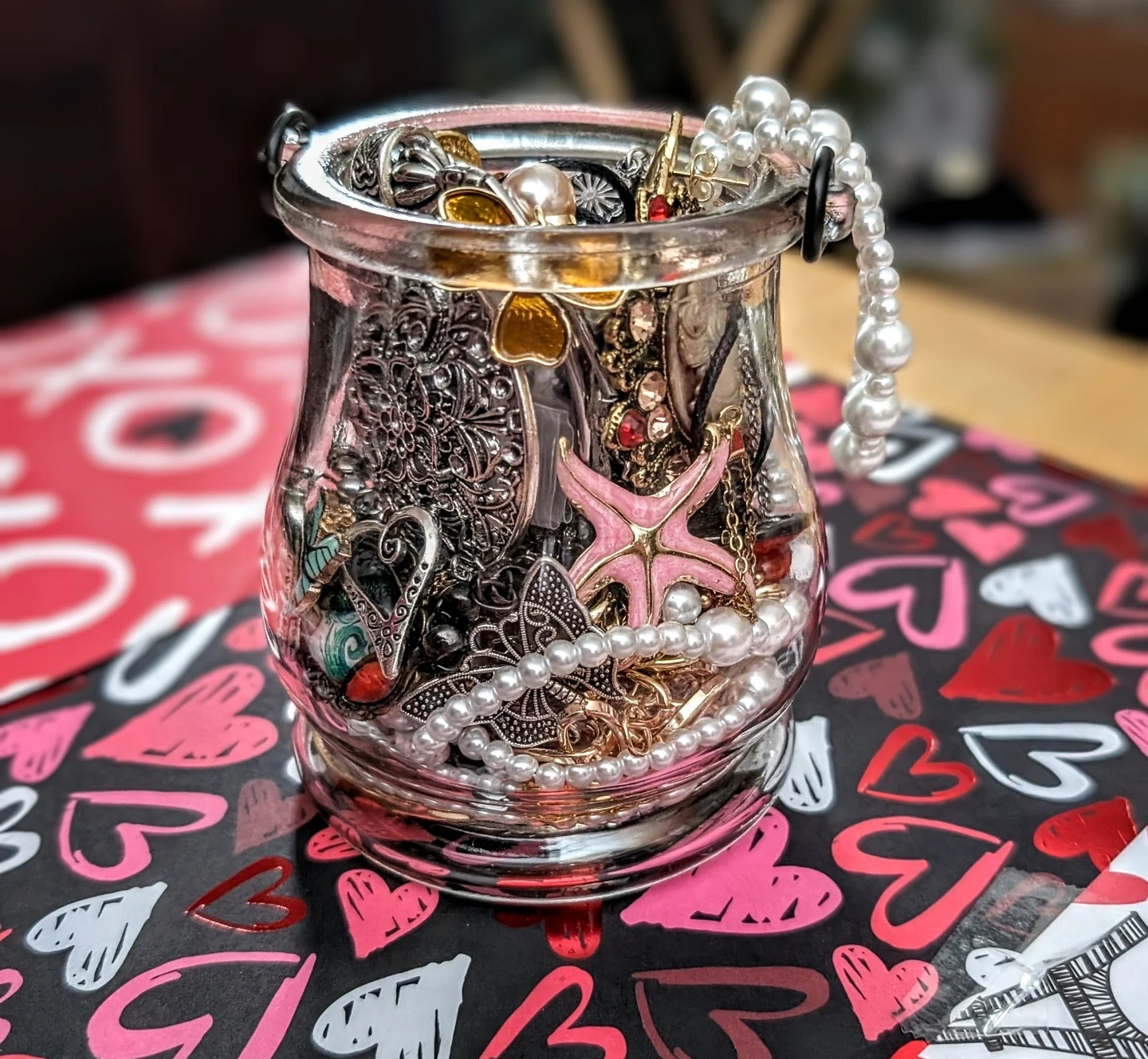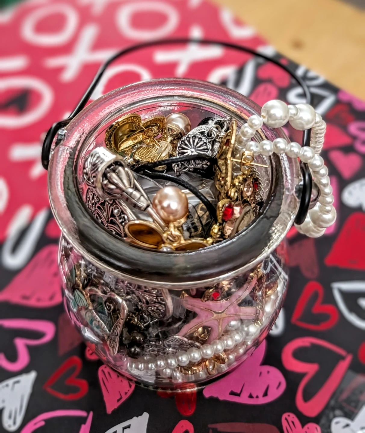 Selling a collection of assorted jewelry filled in a decorative glass jar. Includes necklaces, bracelets, rings, and earrings with various charms like hearts and stars. A fun assortment for accessorizing!