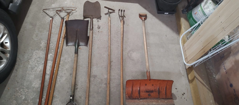 Offering a collection of old yard tools. Items like a rake, shovel, and other tools. Ideal for all your gardening needs. These tools are perfect to get you grounded in nature. Some rust n stuff, if you can salvage it it's yours.