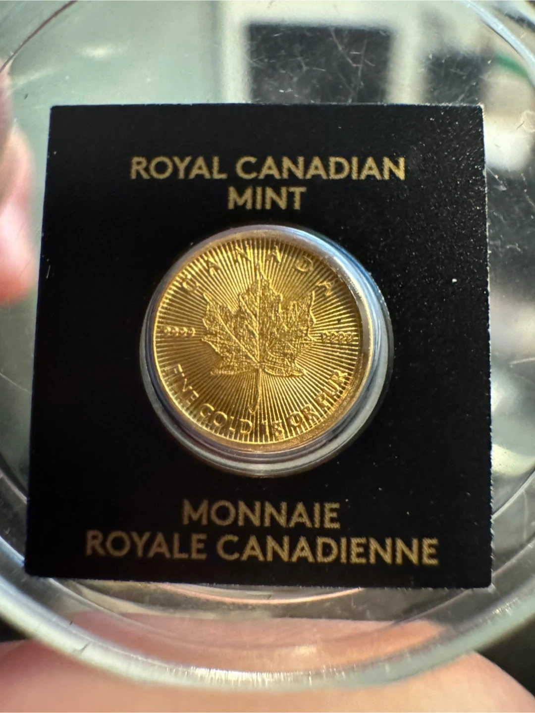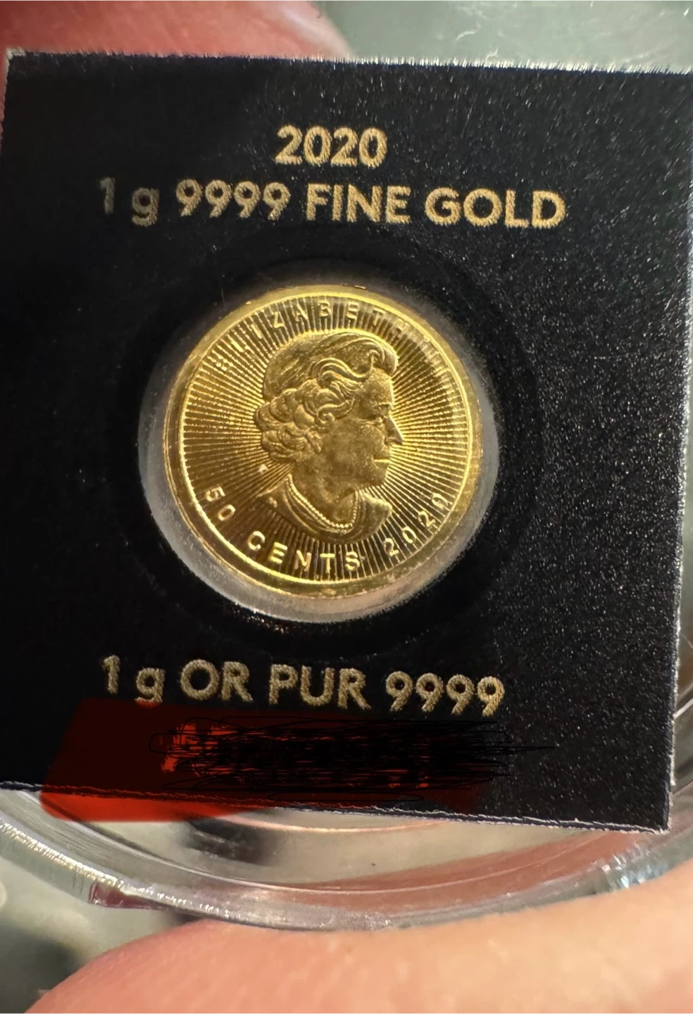 This is a 1 gram coin of 9999 fine gold from the Royal Canadian Mint. It features a maple leaf design on one side and Queen Elizabeth II on the other. The coin is dated 2020. It's a great piece for collectors.