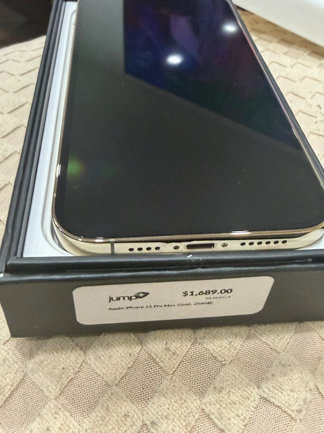 This is an Apple iPhone 13 Pro Max in gold with 256GB of storage. Brand new replacement from apple care, selling for 750$ cash or e-transfer. Can meet at the jump store in stone road mall for validation.