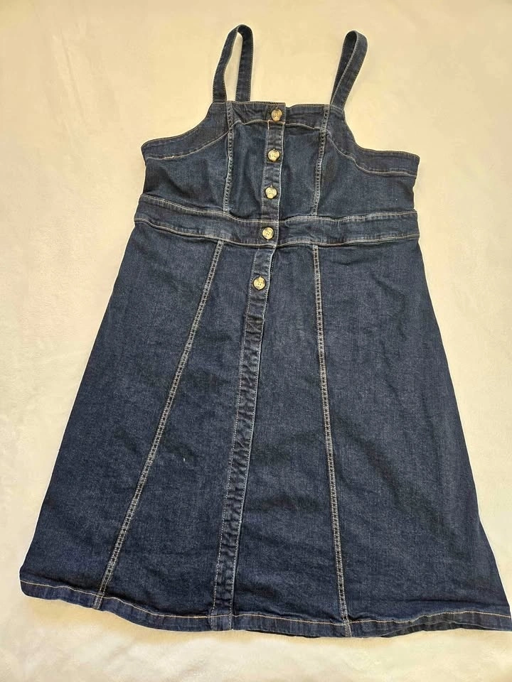 Denim dress with straps and button front. Nice topstitching with contrasting thread.