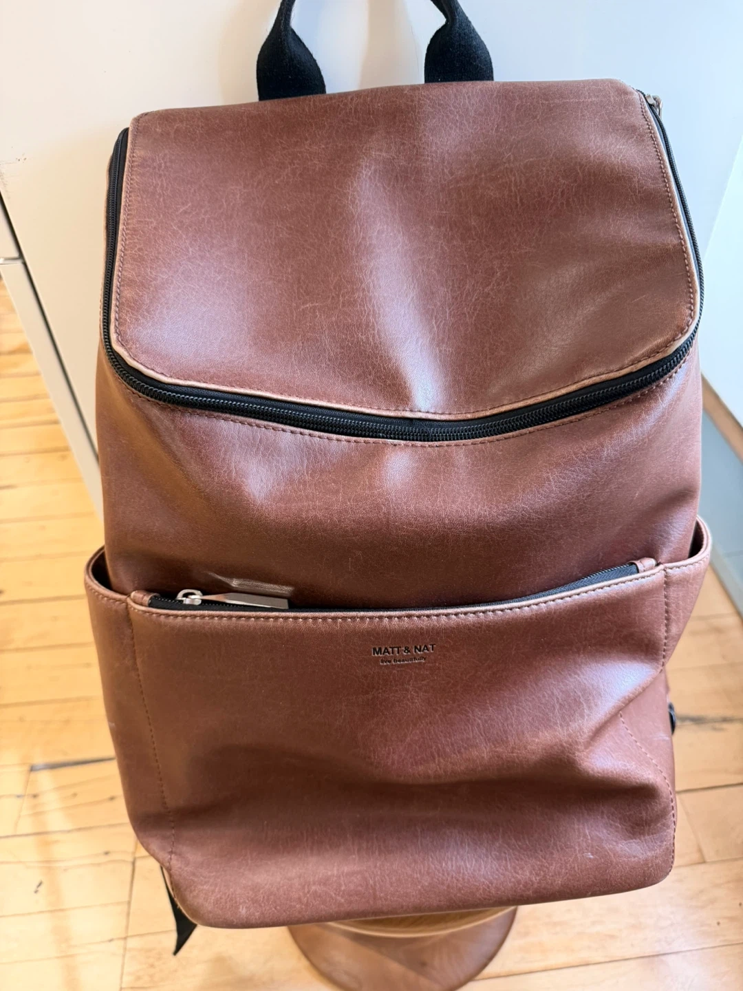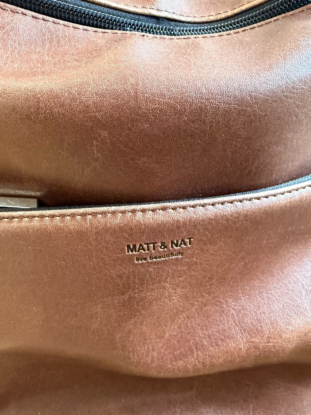 This Matt & Nat backpack is made from brown faux leather with a recycled plastic bottle lining. It has multiple zippered compartments. It's a stylish and practical bag for everyday use - there is a compartment inside the bag for laptop storage.