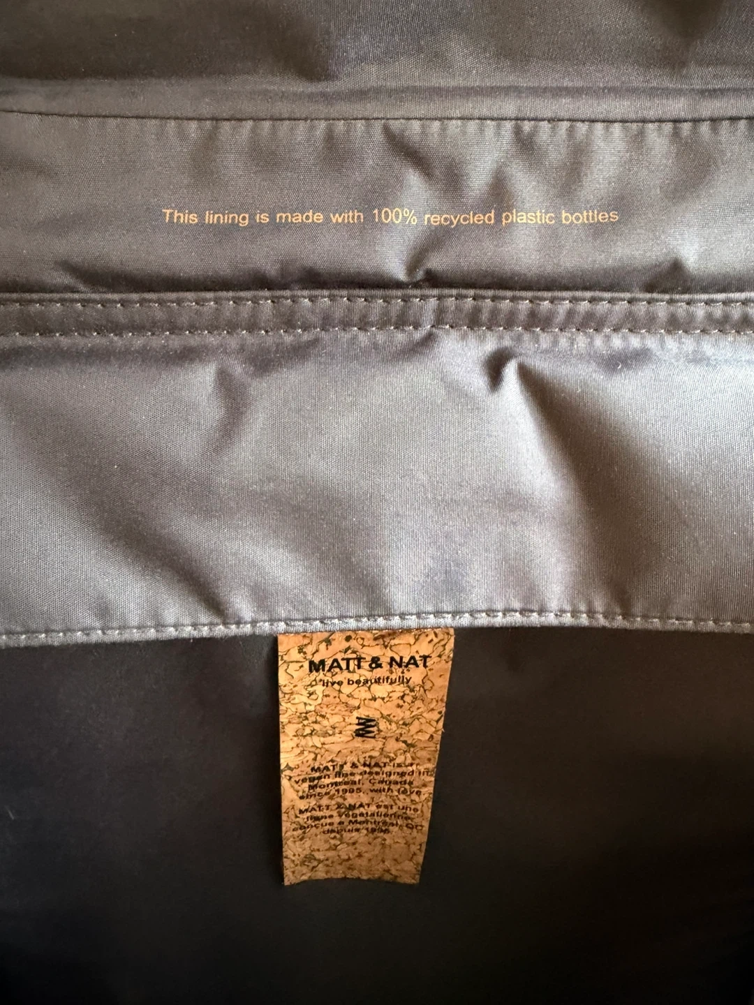 This Matt & Nat backpack is made from brown faux leather with a recycled plastic bottle lining. It has multiple zippered compartments. It's a stylish and practical bag for everyday use - there is a compartment inside the bag for laptop storage.