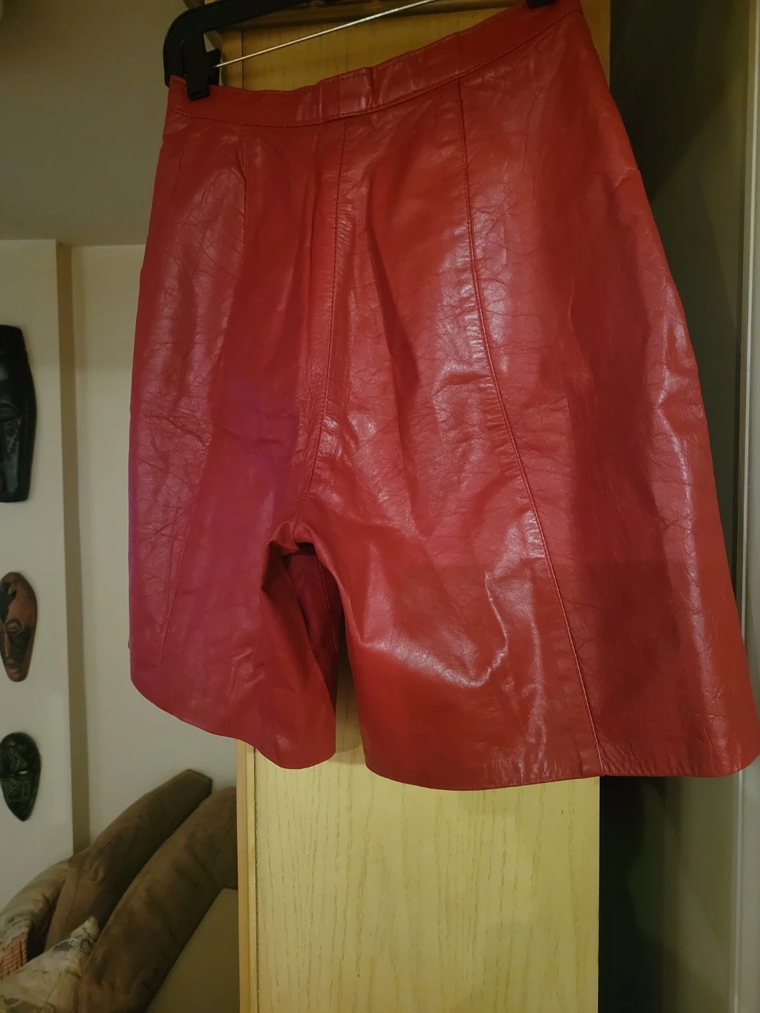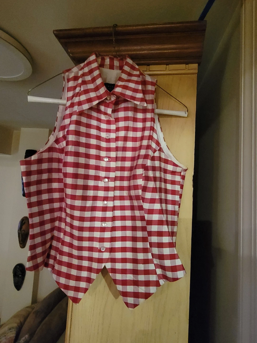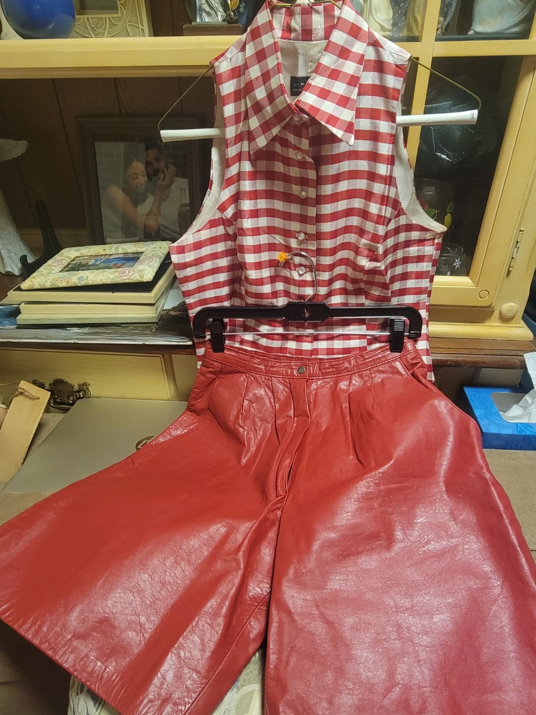 Red leather shorts and a red and white gingham print sleeveless button-up vest. These pieces can be worn together or separately for a unique look!
