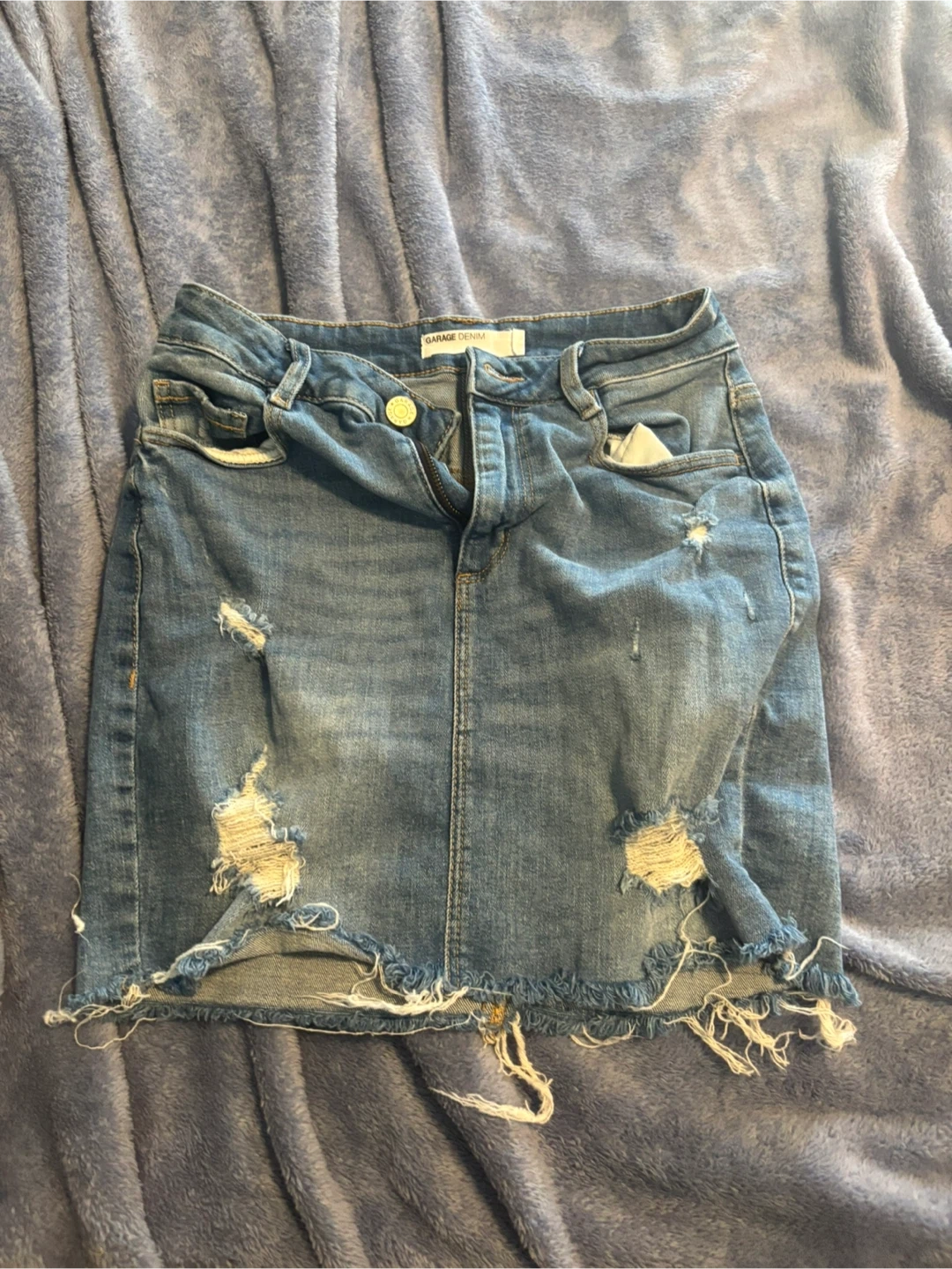 Garage Denim skirt in a distressed blue wash. It's a size XS. This skirt features ripped detailing and a raw hem for a trendy look.