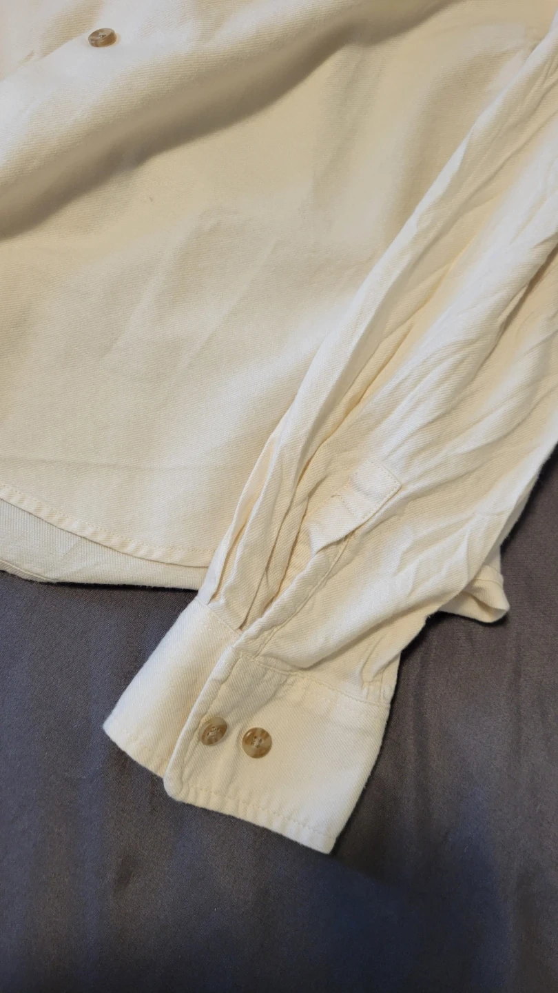 This is a cream-coloured long-sleeved button-up shirt from Uniqlo. It's a size medium and features a classic collar and button cuffs. The fabric is a soft cotton blend.