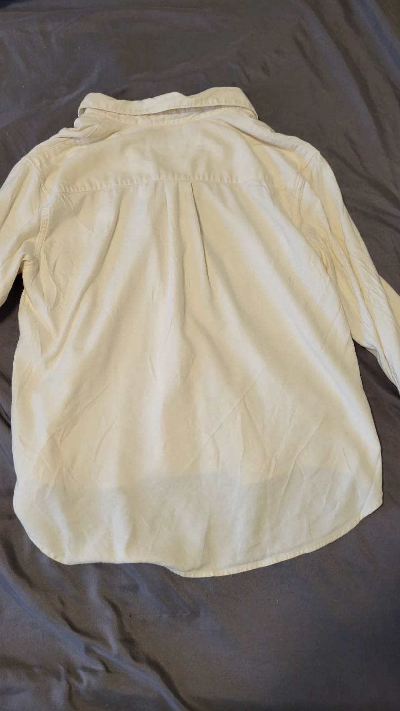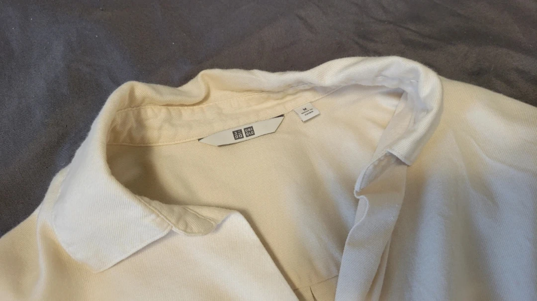 This is a cream-coloured long-sleeved button-up shirt from Uniqlo. It's a size medium and features a classic collar and button cuffs. The fabric is a soft cotton blend.
