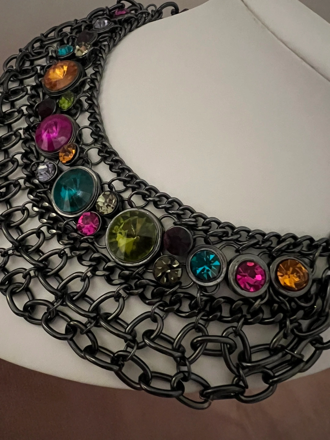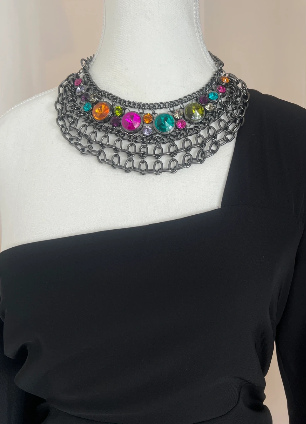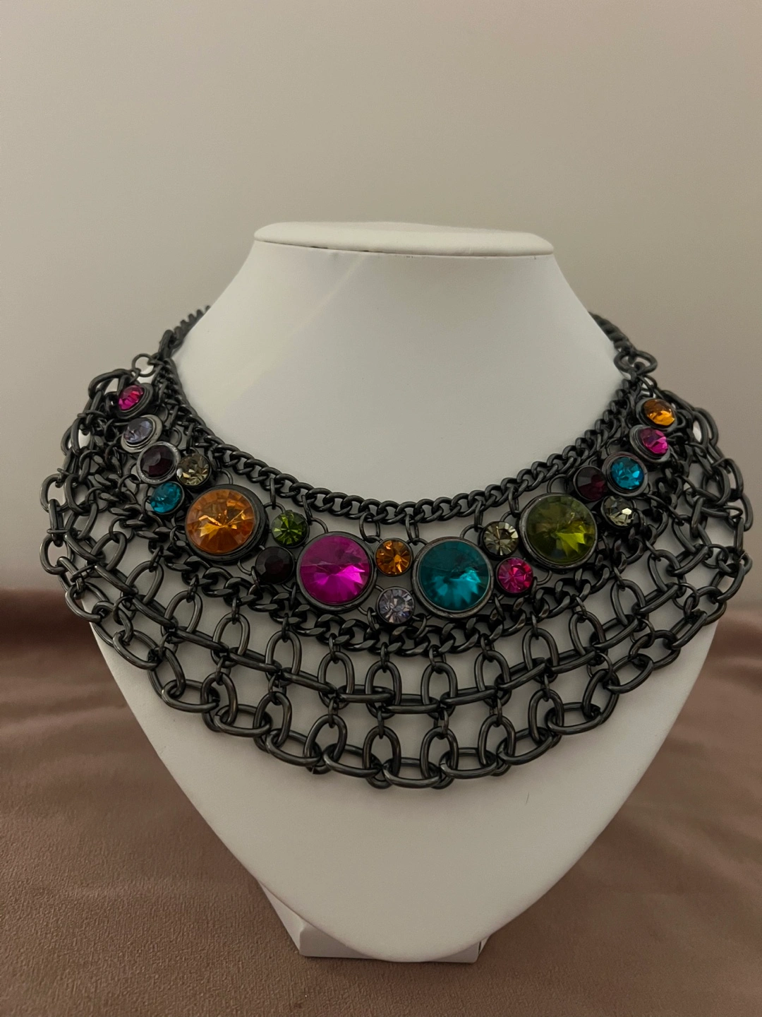 Stunning statement necklace. Features layers of dark grey metal chain and colourful gemstones. Perfect for adding a touch of glamour to any outfit.