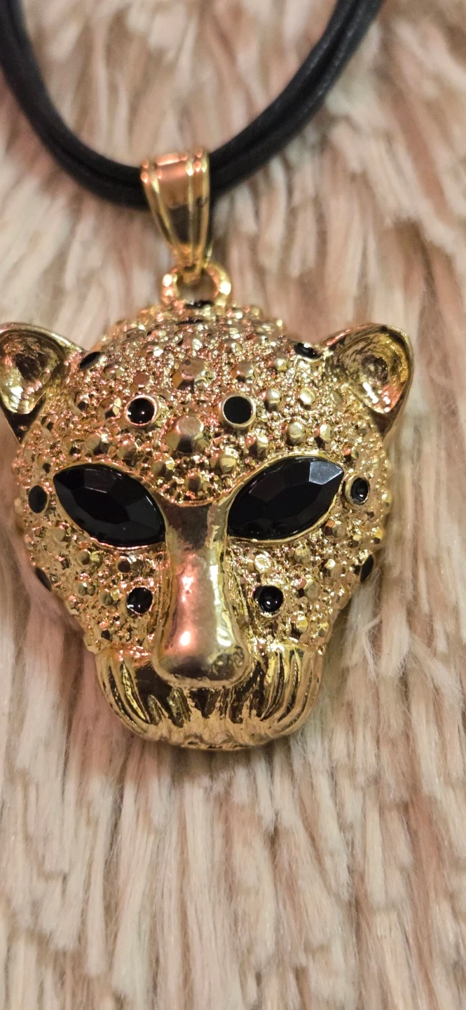 Selling a gold-tone leopard pendant necklace. The pendant features black accents and a black cord. It's a unique piece to add to your collection!