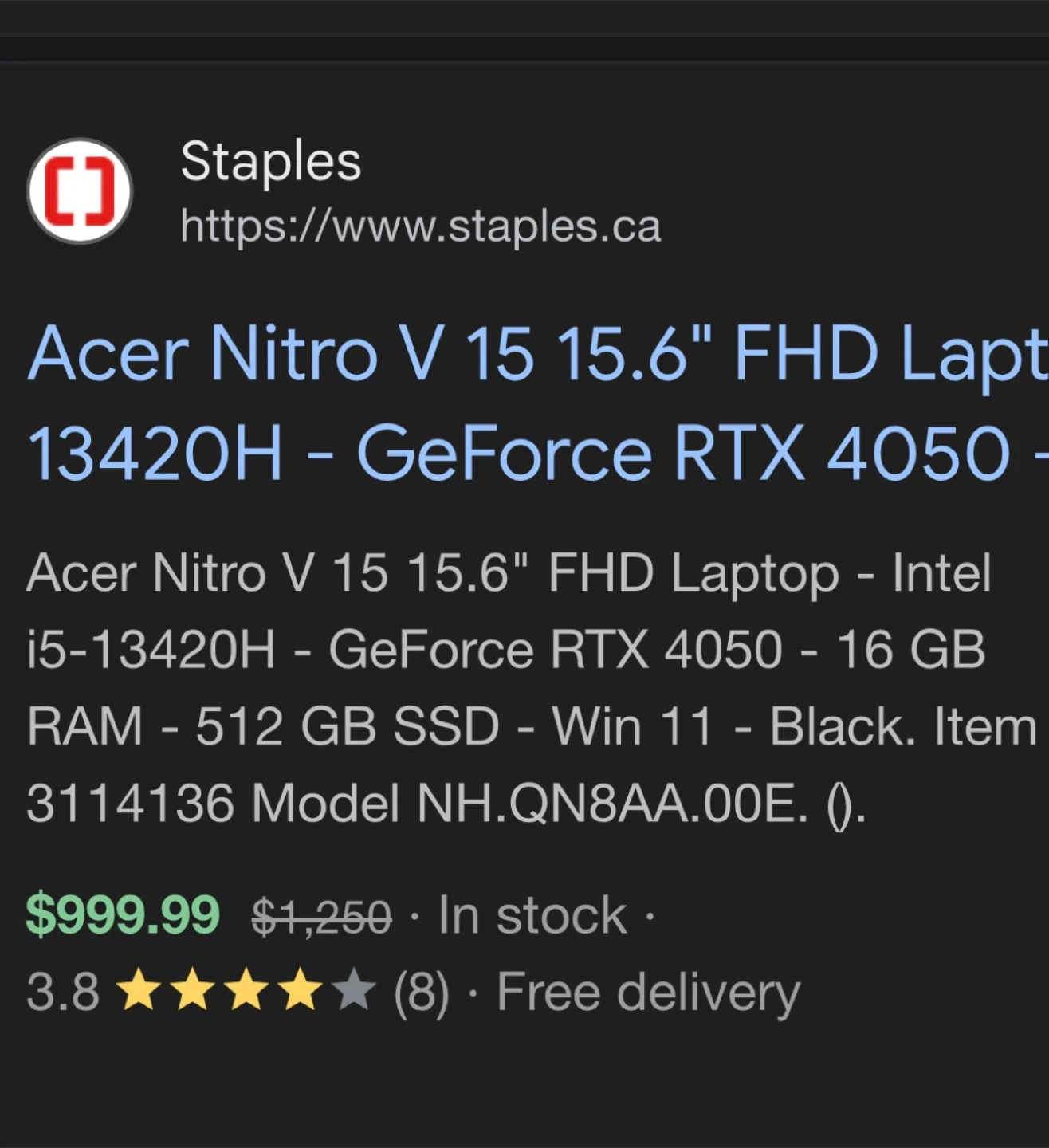 Acer Nitro V 15 laptop with a 15.6" FHD display. It's powered by an Intel i5-13420H processor and NVIDIA GeForce RTX 4050 graphics. This model comes with 16 GB of RAM and a 512 GB SSD. It runs Windows 11 and is black in colour. This laptop's suitable for gaming and intensive tasks!