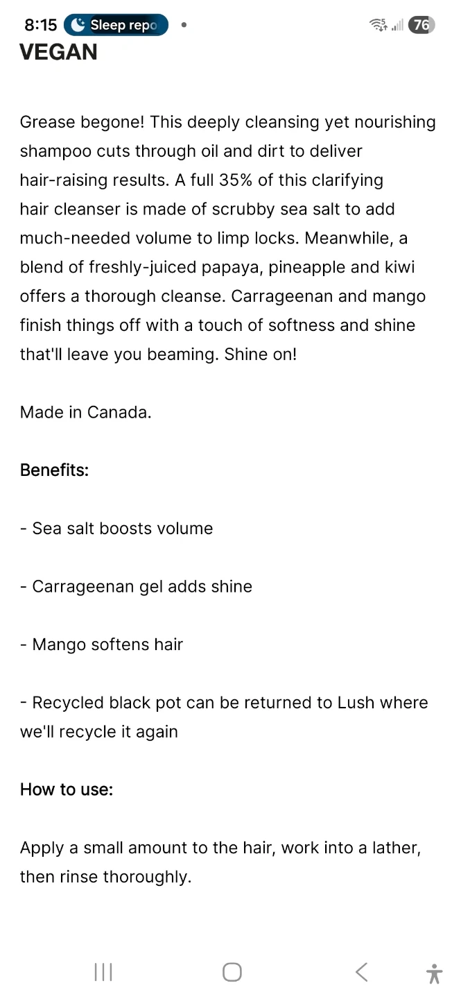 Get shiny, squeaky-clean hair with this clarifying shampoo. It's made with scrubby sea salt for volume and fruit juices for shine. 125g pot.
