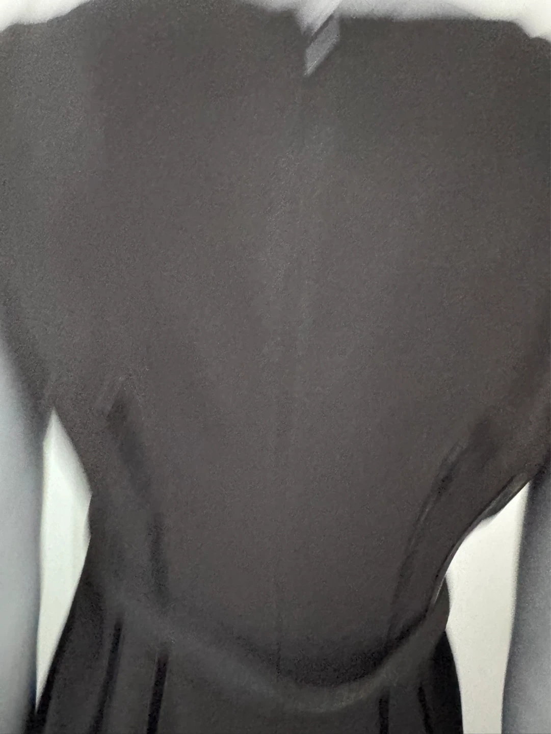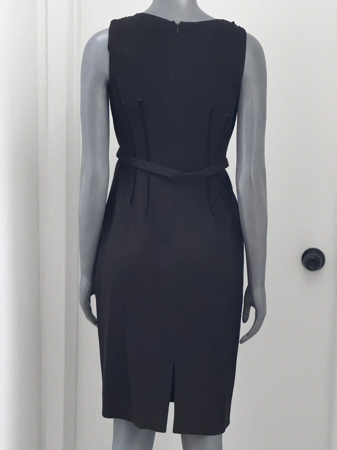 Anne Klein sleeveless black dress featuring a decorative ruffle accent around the neckline and a matching belt at the waist. It has a velvet strips at waist and a concealed back zipper closure. The skirt includes a back vent for ease of movement. NWT