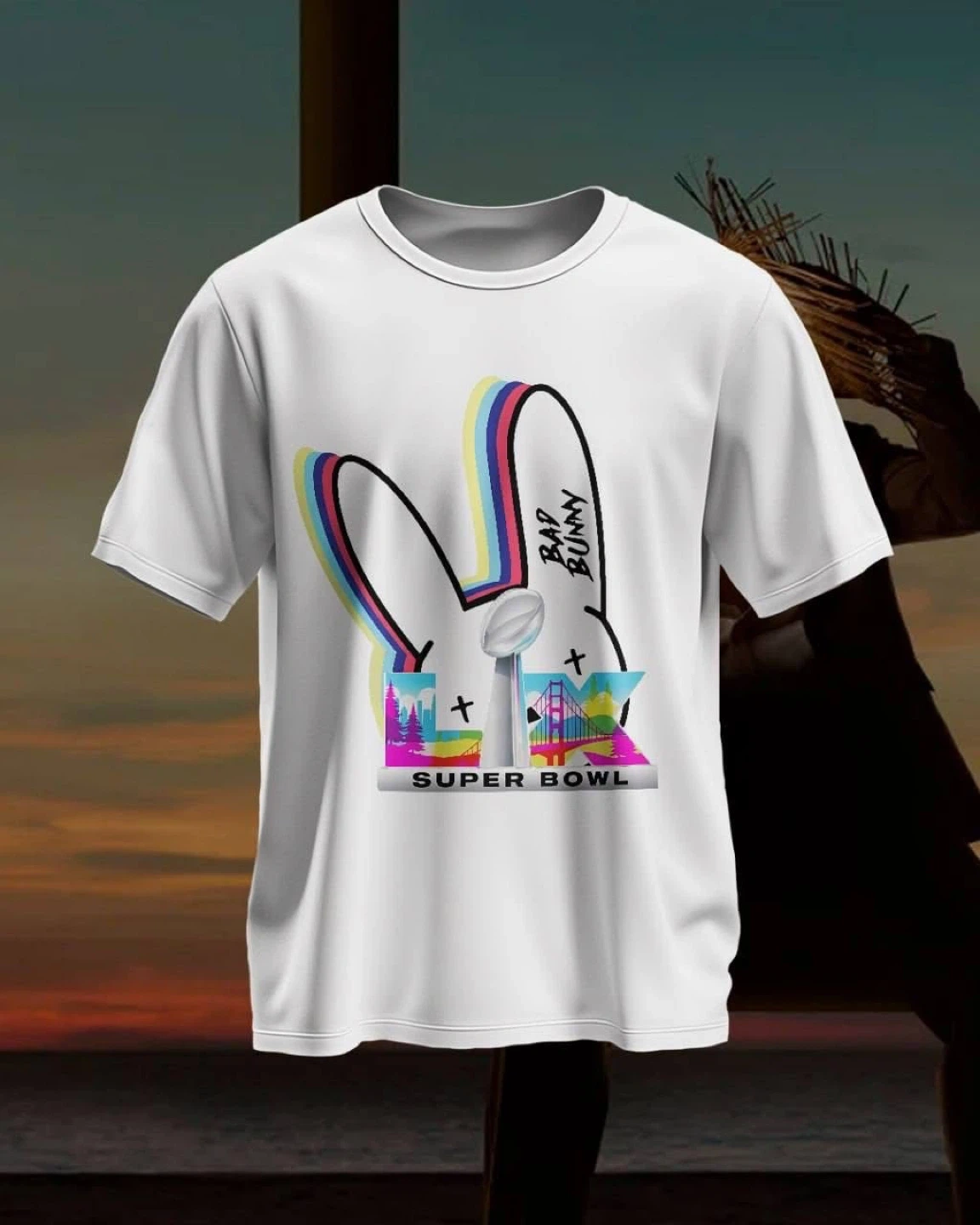 White t-shirt with a graphic print. Features a man sitting on a football goal post. The text 'Benito Bowl' is also printed on the shirt. Made of cotton.