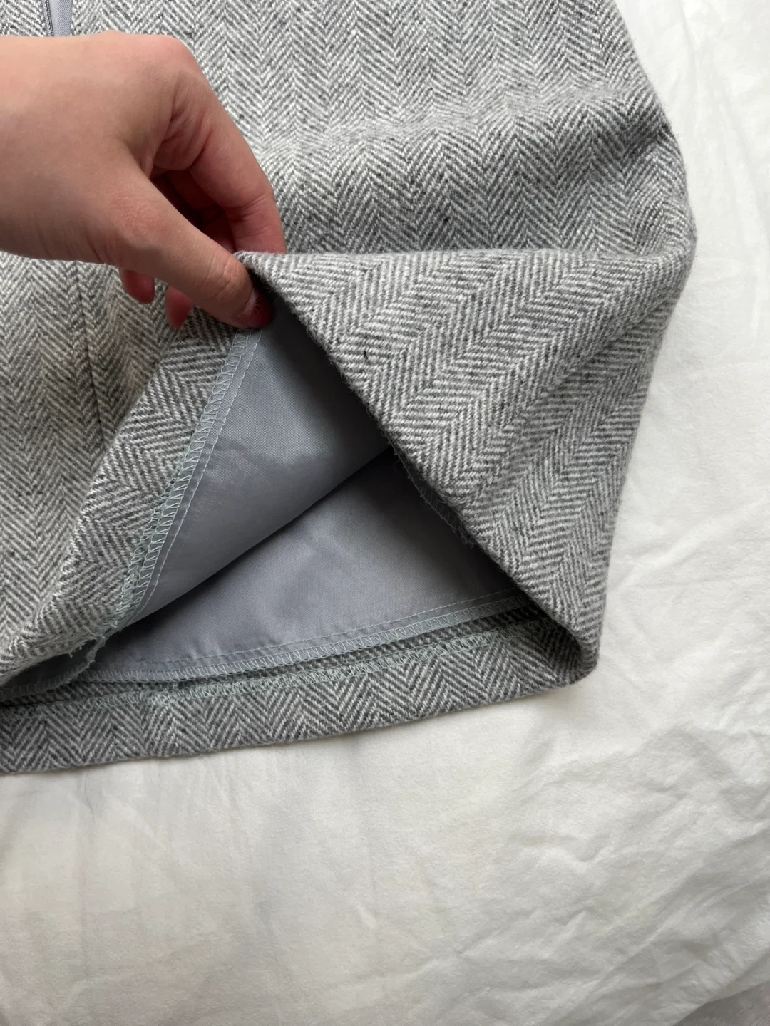 Grey IAMTIZZI skirt in a herringbone pattern. It's a size medium with a smooth lining. Features a back zipper closure.