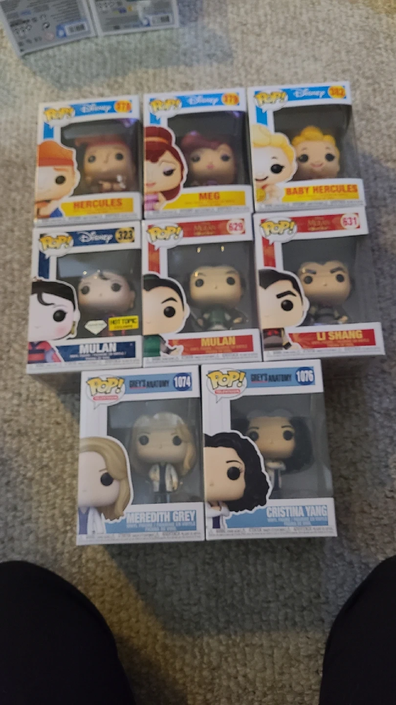 Selling a collection of Funko Pop! figures, including characters from Disney's Hercules and Mulan, as well as Grey's Anatomy. They are all in their original boxes and ready for a new home!