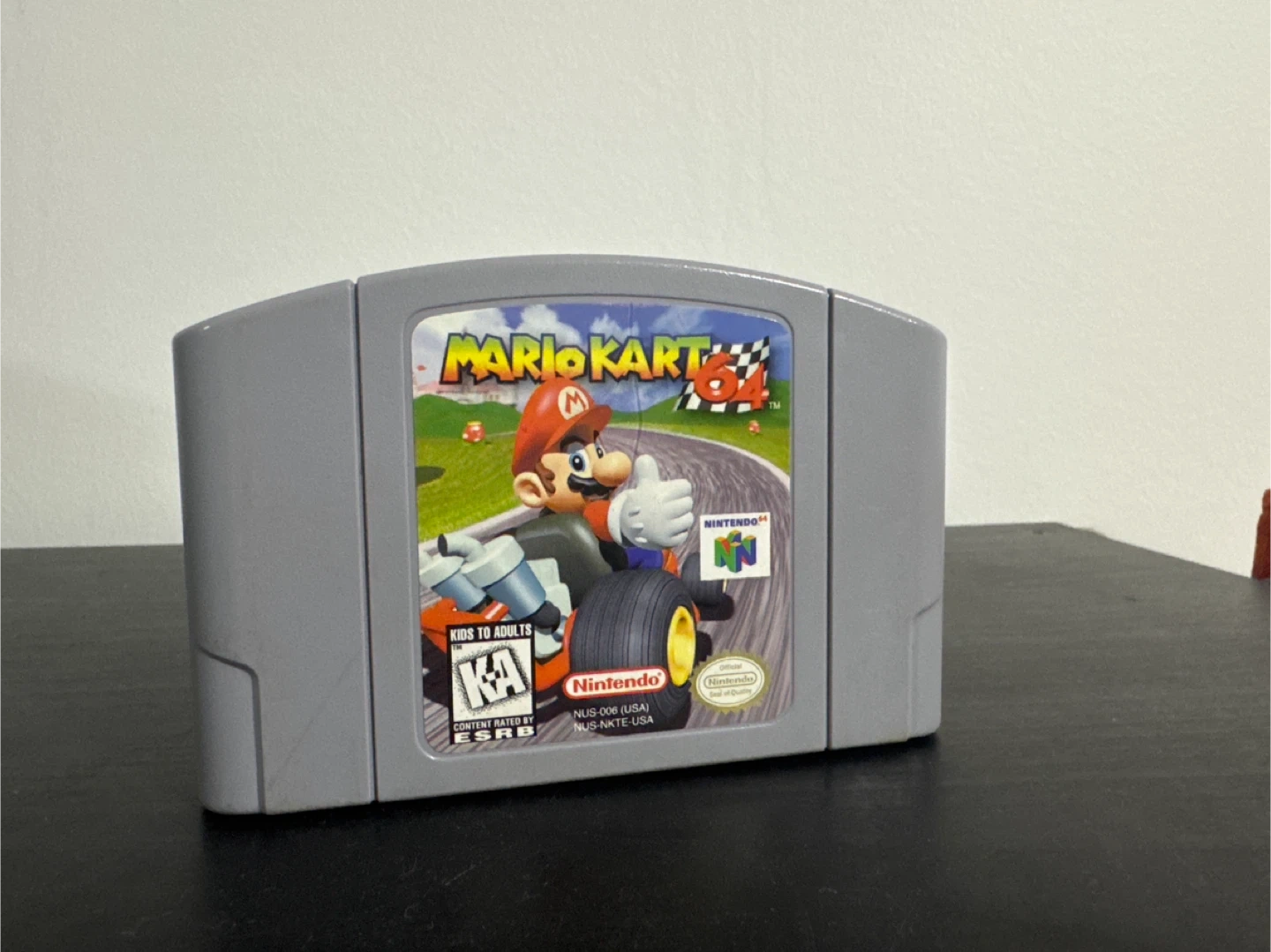 This is the Mario Kart 64 game cartridge for the Nintendo 64. It's rated KA for Kids to Adults by ESRB. NUS-006 (USA) model.