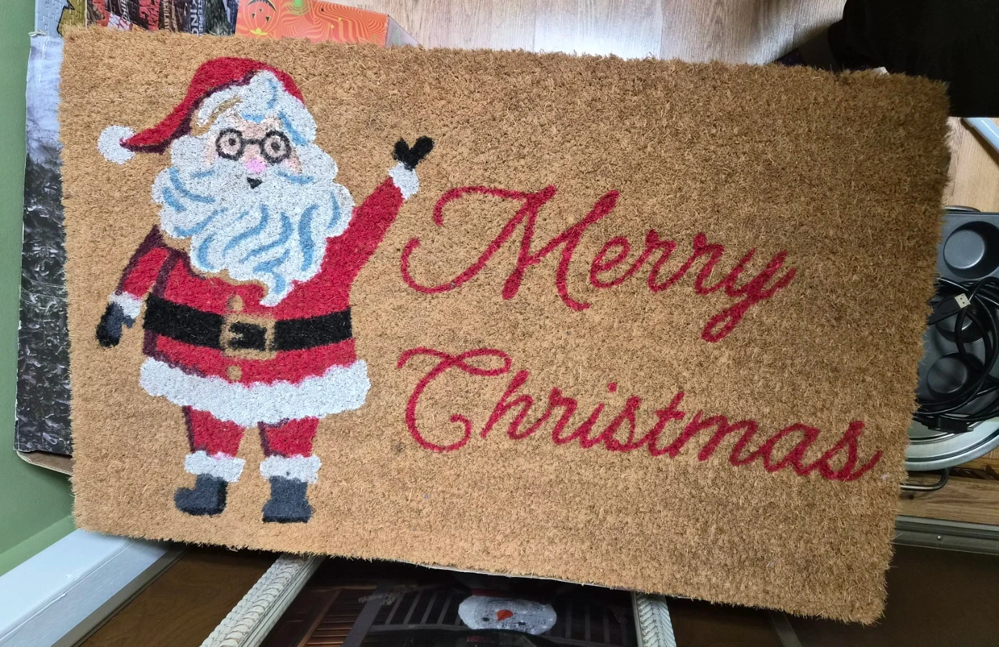 Welcome guests this holiday season with this festive doormat! It features a jolly Santa Claus illustration and the words 'Merry Christmas' in a script font. Made from durable coir material, it's perfect for greeting visitors at your doorstep. A great way to add some cheer to your home's entrance!