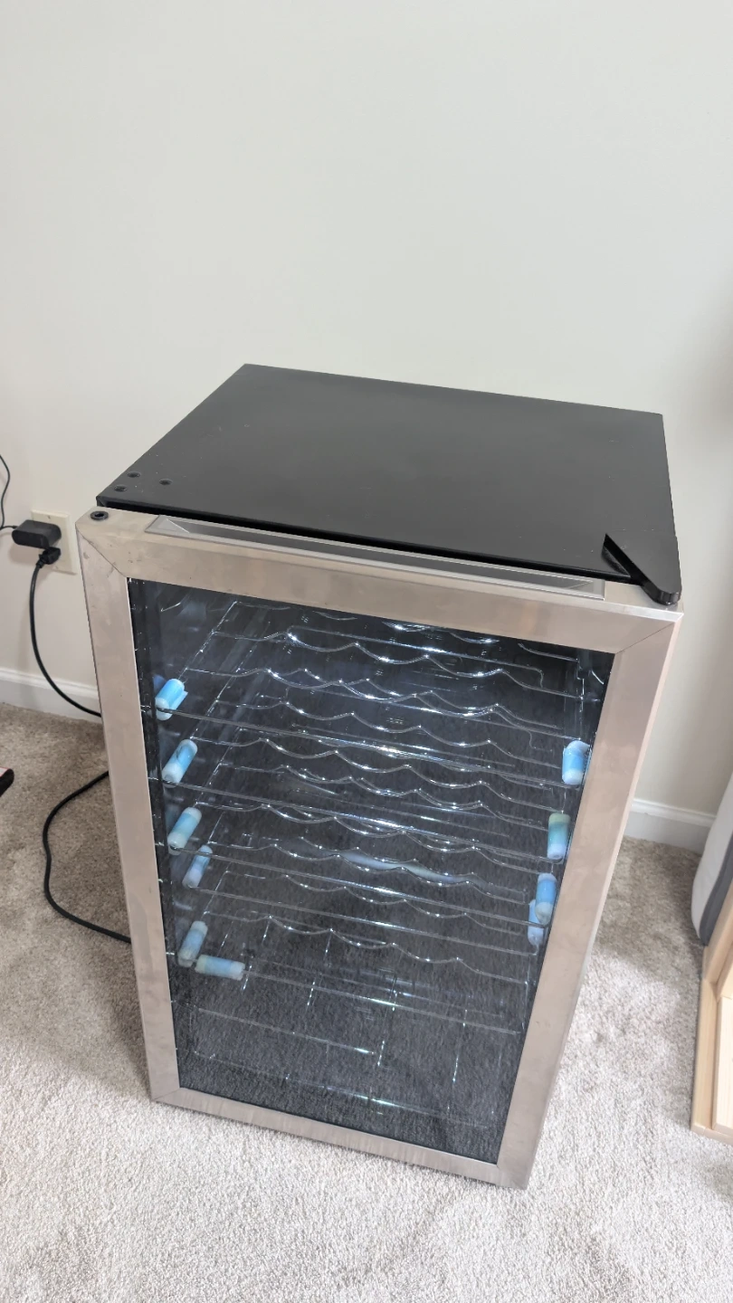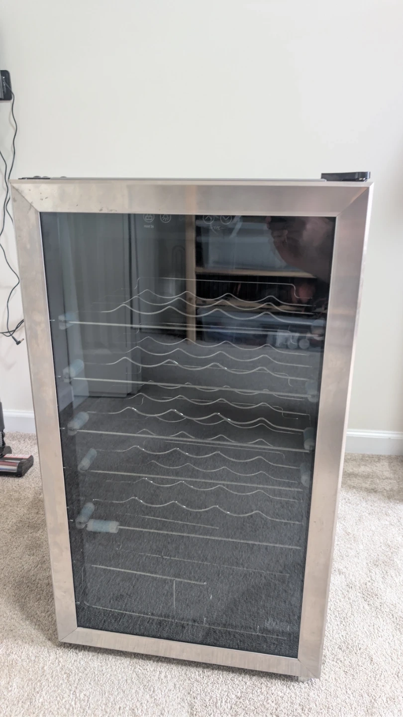 Insignia wine cooler - lightly used, perfect condition. It's a 29-bottle capacity model with a stainless steel finish. The unit has multiple racks for organizing your bottles.