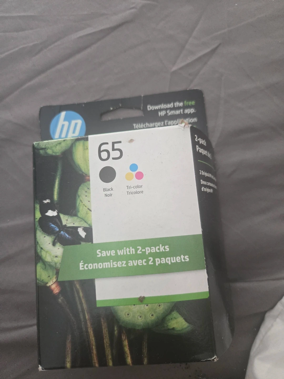 Selling a 2-pack of HP 65 ink cartridges. Includes one black and one tri-color cartridge. The ink cartridges are made with over 40% recycled plastic on average. Expiry date is May 2027. Save with 2-packs!