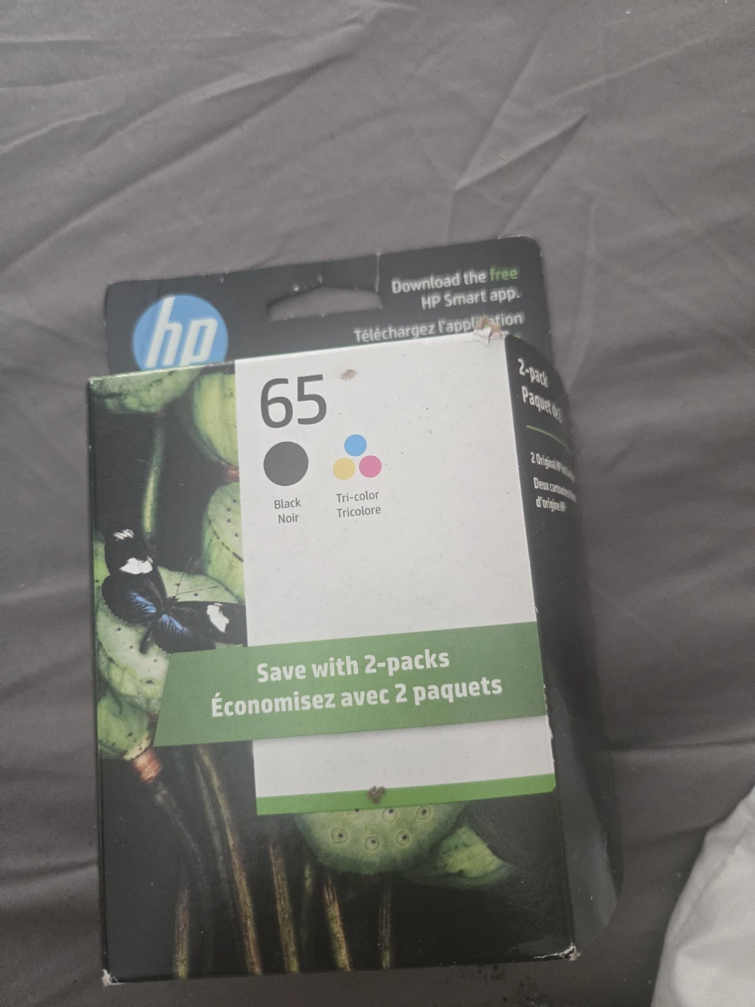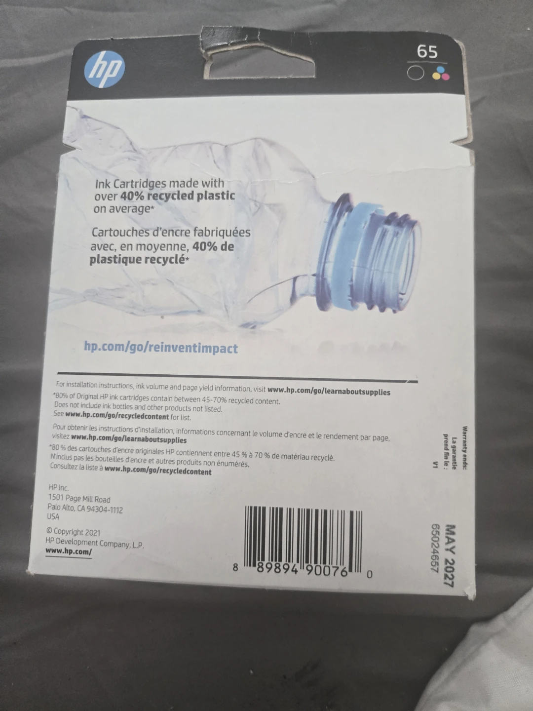 Selling a 2-pack of HP 65 ink cartridges. Includes one black and one tri-color cartridge. The ink cartridges are made with over 40% recycled plastic on average. Expiry date is May 2027. Save with 2-packs!