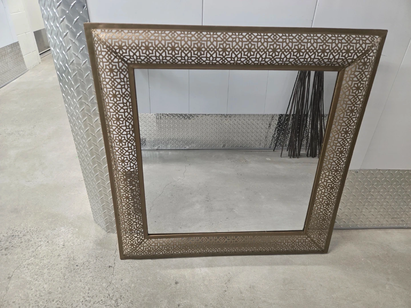 Beautiful decorative mirror with a gold metal frame featuring an intricate geometric pattern. It's perfect for adding a stylish touch to any room. The frame's design is eye-catching and adds a touch of elegance to your home decor. A great accent piece for your living room, bedroom, or hallway!