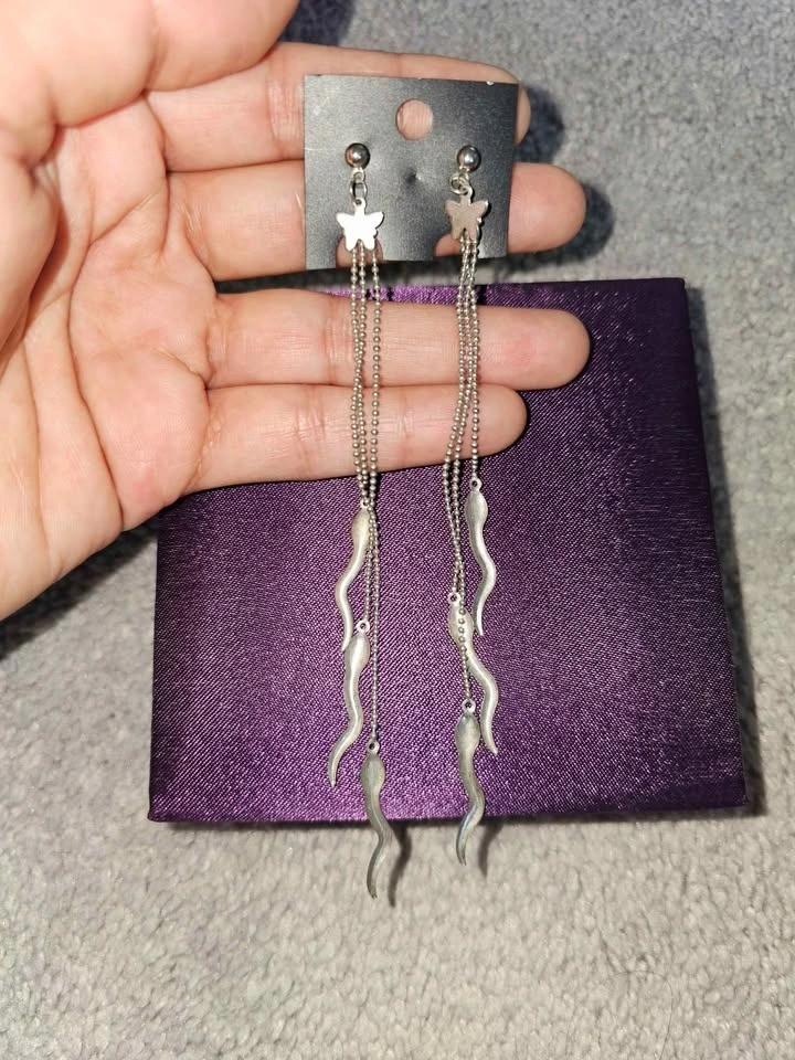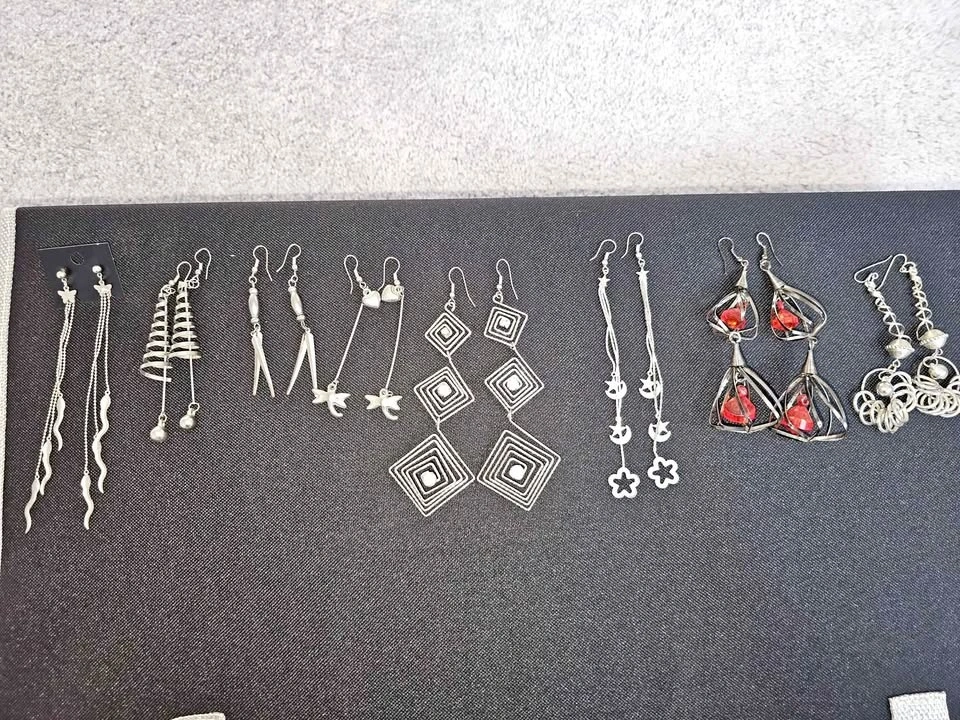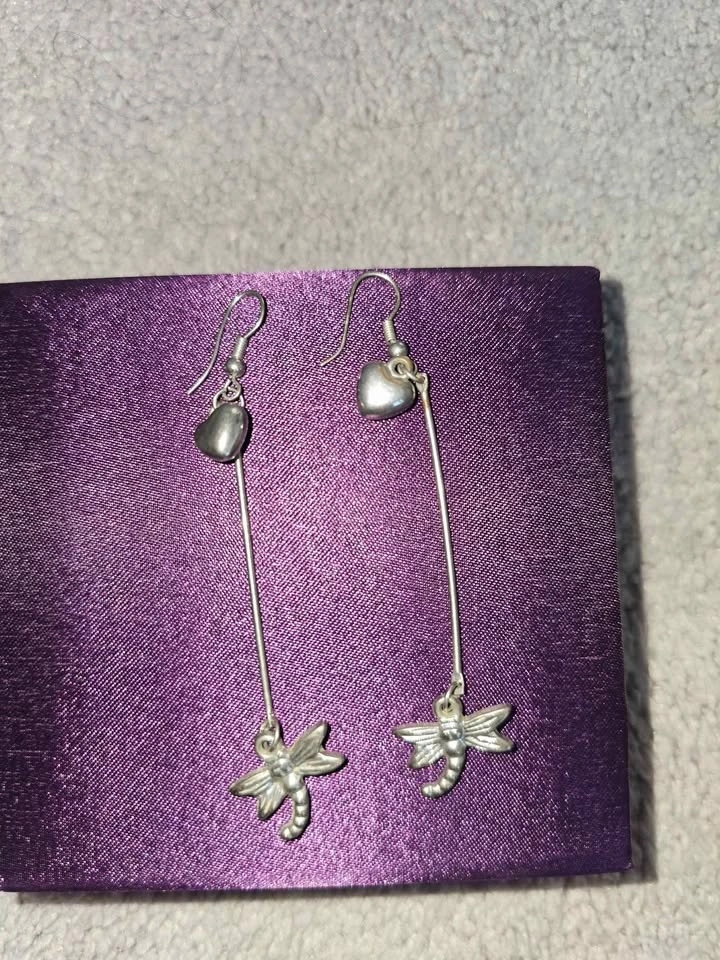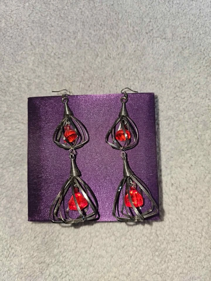 Stylish collection of dangle earrings. Has butterfly, spiral, heart with dragonfly, geometric, and red bead cage designs. All silver-toned. Great for adding a touch of flair to any outfit. Mix and match or wear your favorite pair!