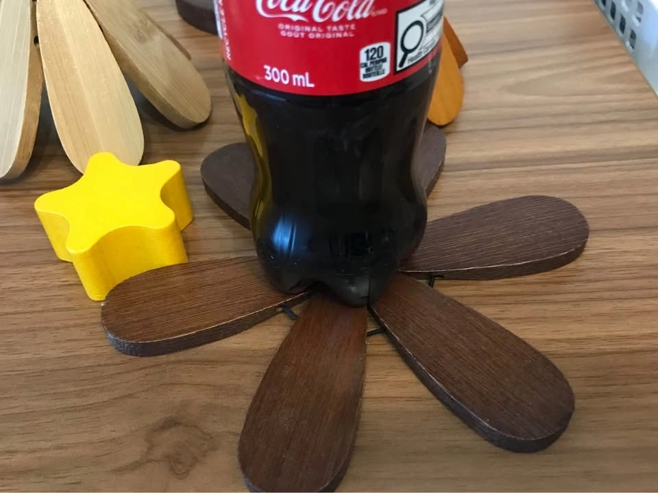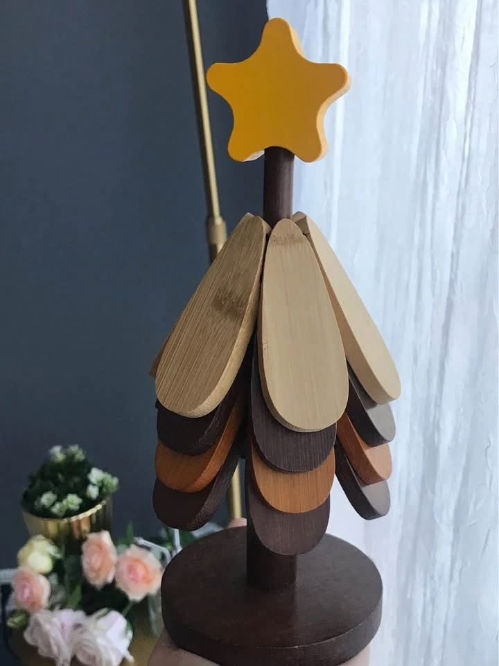 The design of these coasters, made from bamboo and wood, a tidy storage solution, resembling a mini Christmas tree.