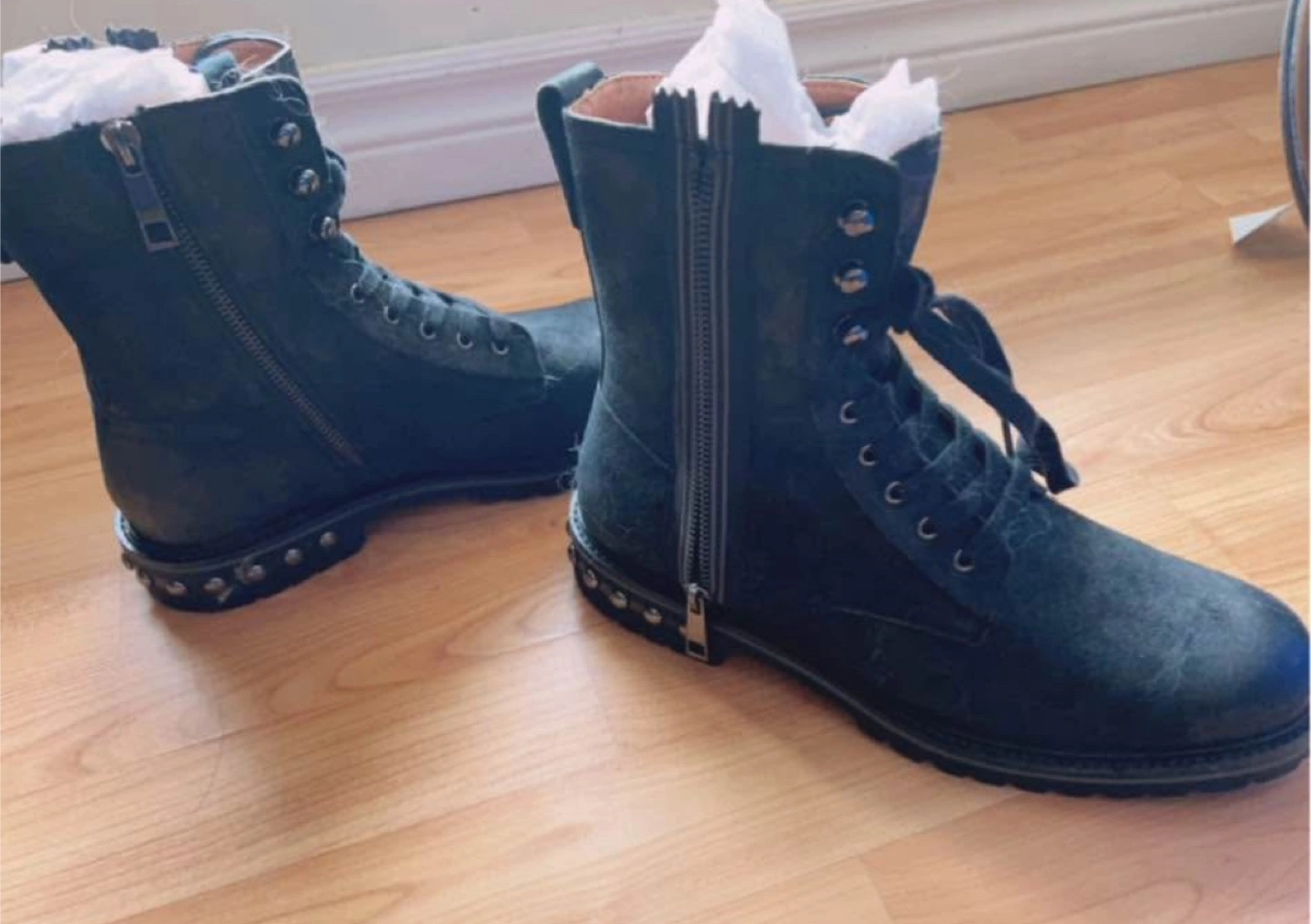 Stylish black ankle boots with lace-up and zipper detail! They have a cool, edgy look with the studded sole. Great for adding some flair to your outfit