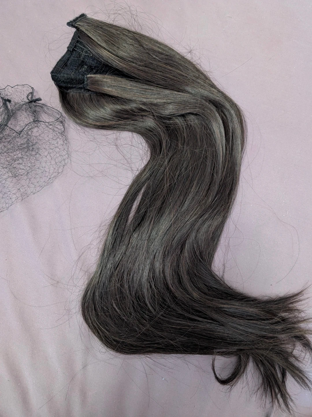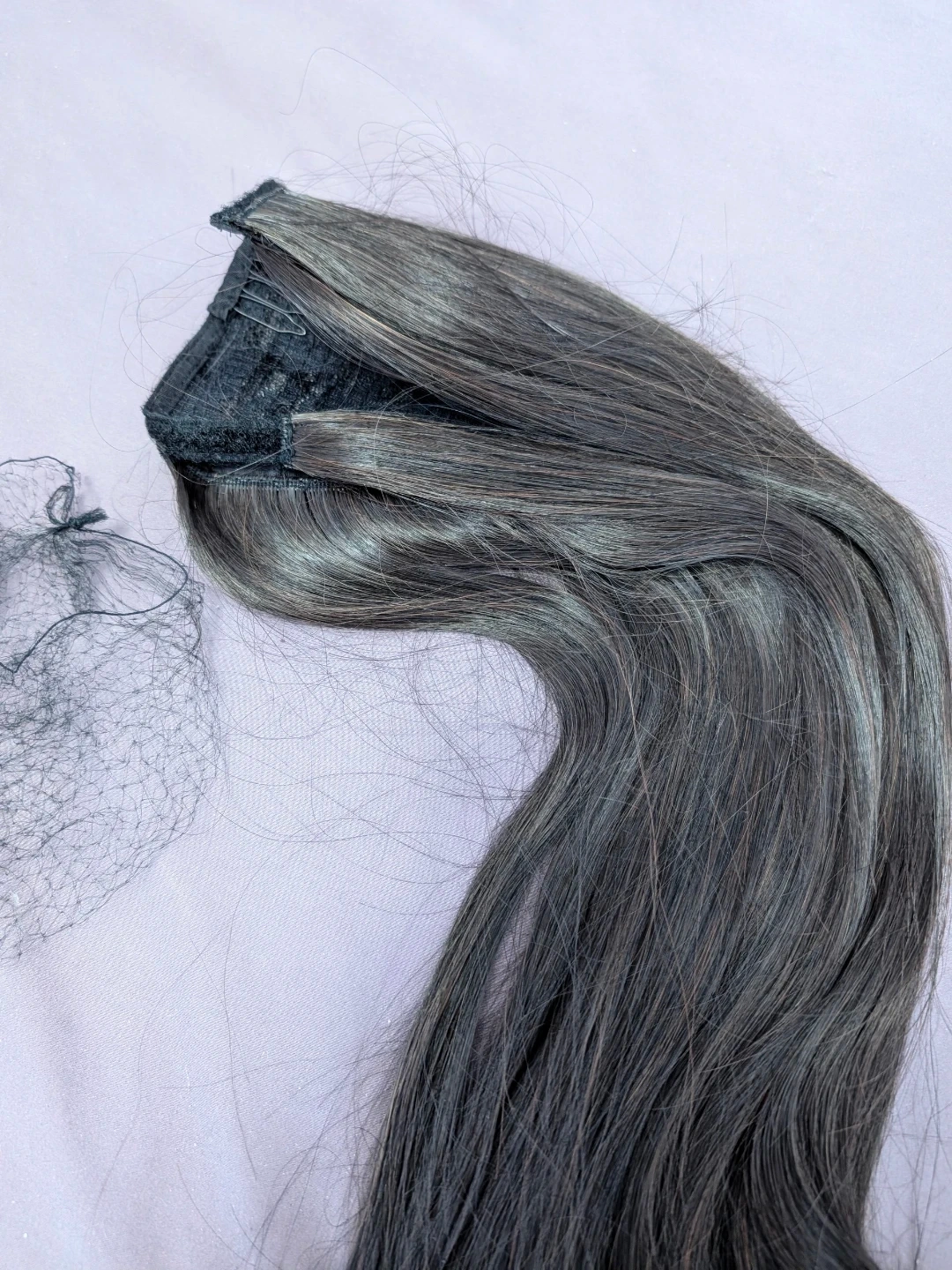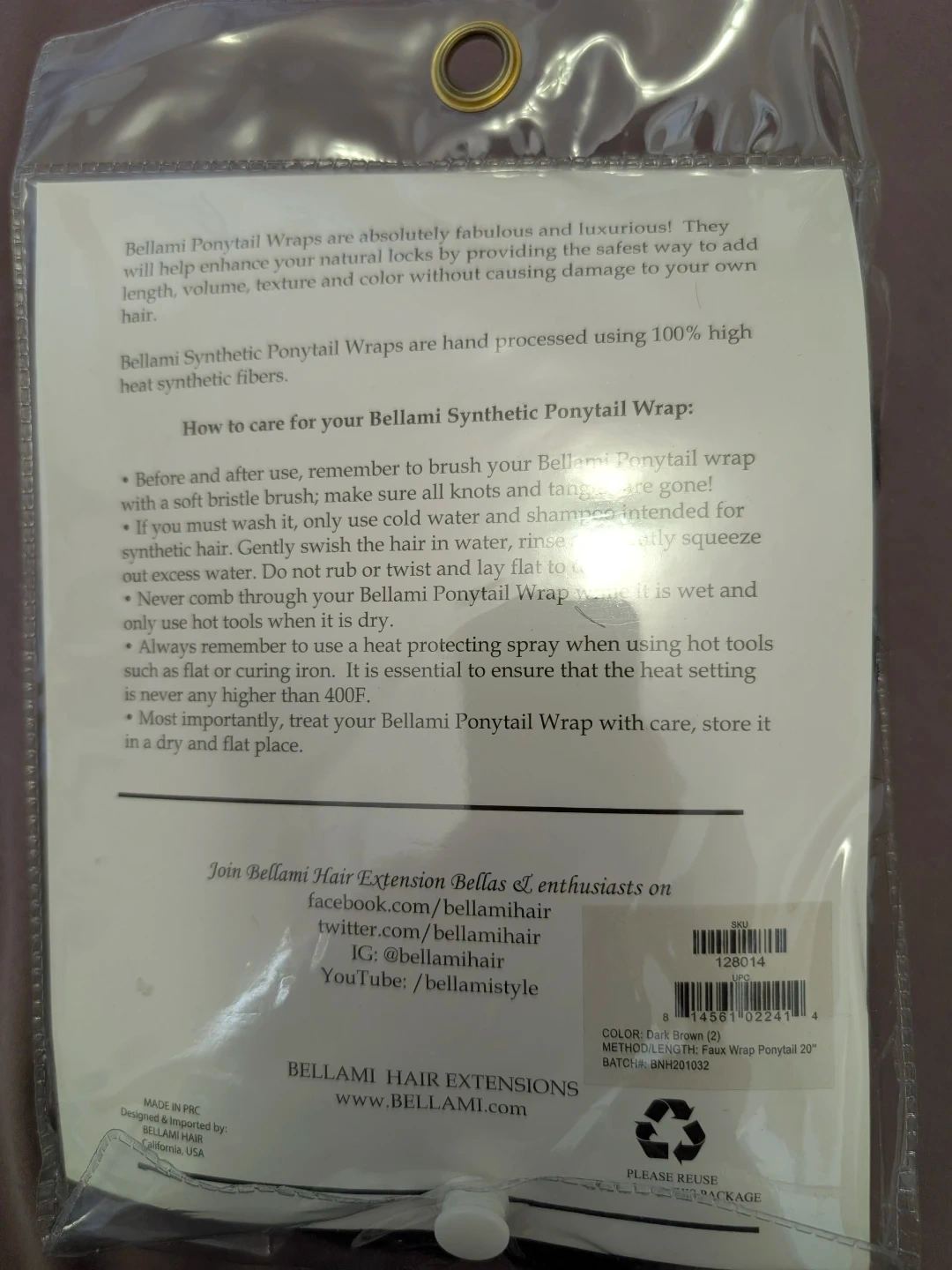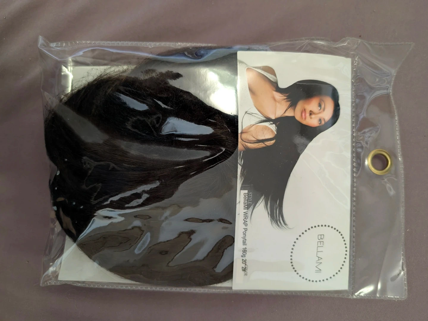 Bellami Faux Wrap Ponytail. It's 20 inches long and dark brown. Includes a hair net. This is a great way to add volume and length to your hair! Never used!!