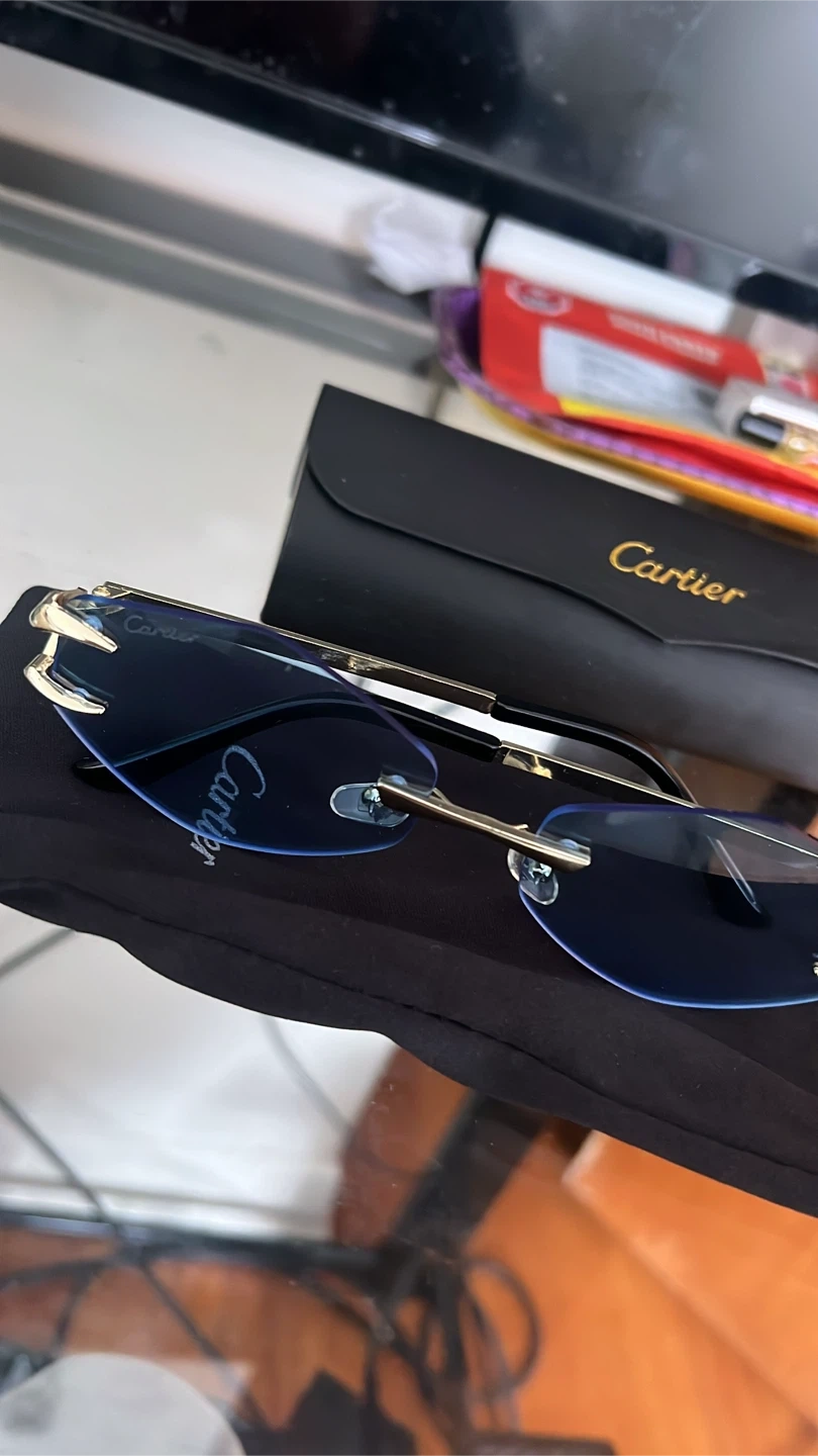Cartier rimless sunglasses with blue lenses. Includes the original black Cartier case. These shades are stylish and perfect for sunny days!