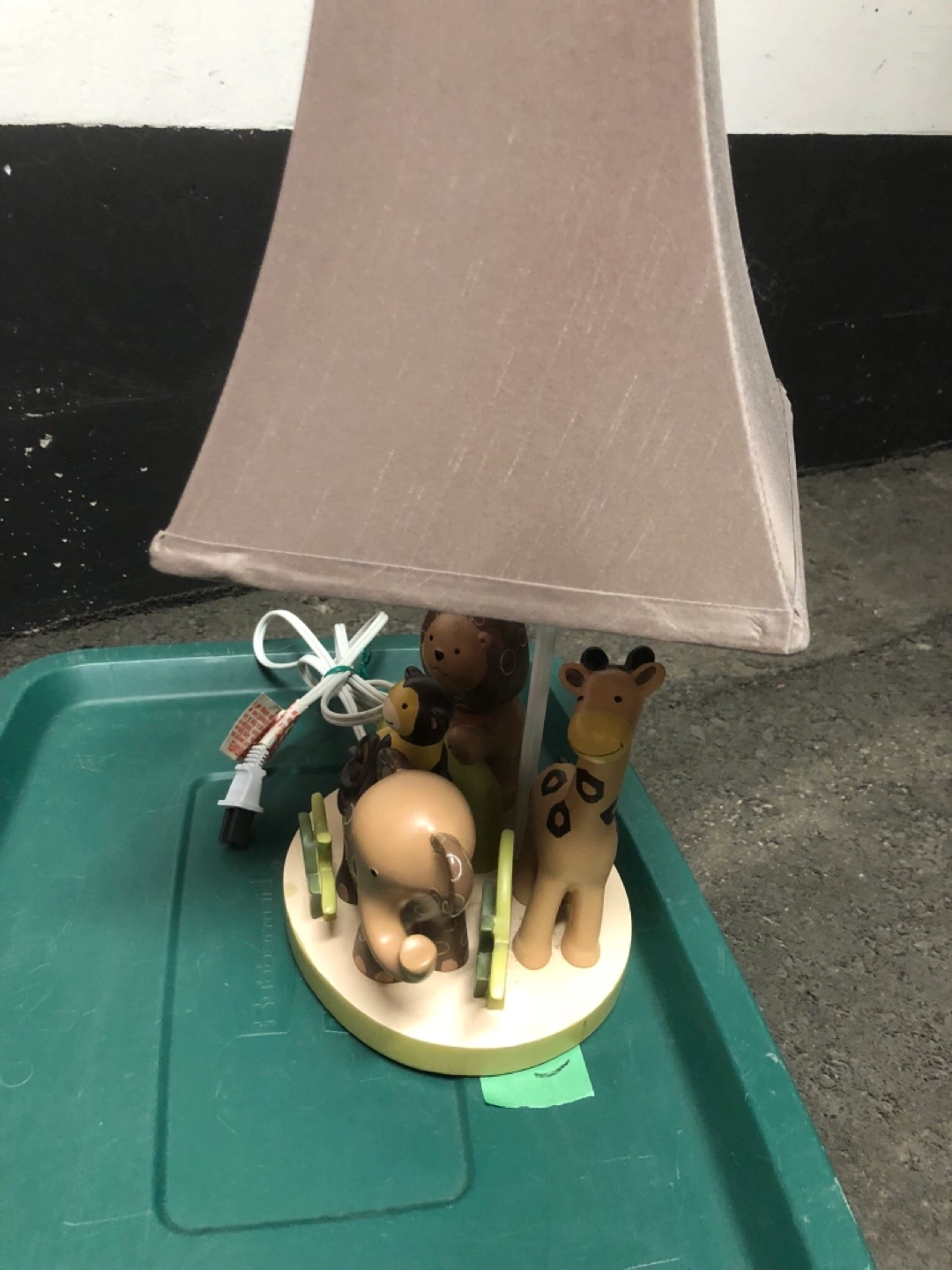 Cute nursery lamp featuring a lion, monkey, giraffe, and elephant. Beige fabric shade. Perfect for a child's room.