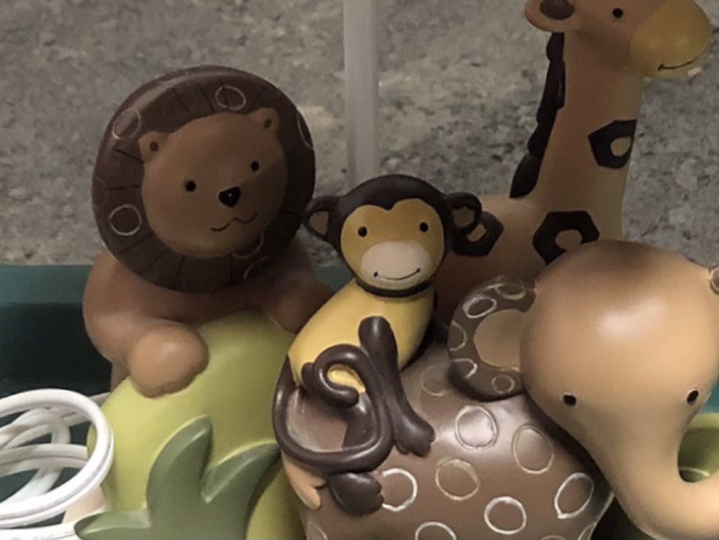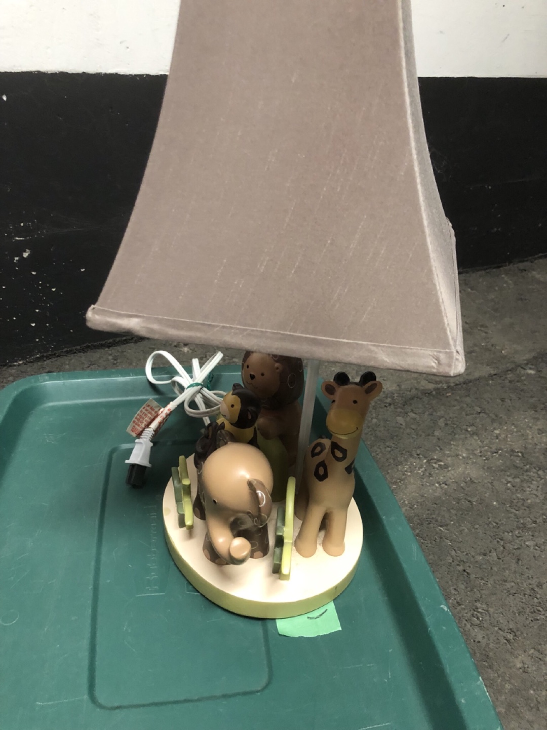 Cute nursery lamp featuring a lion, monkey, giraffe, and elephant. Beige fabric shade. Perfect for a child's room.