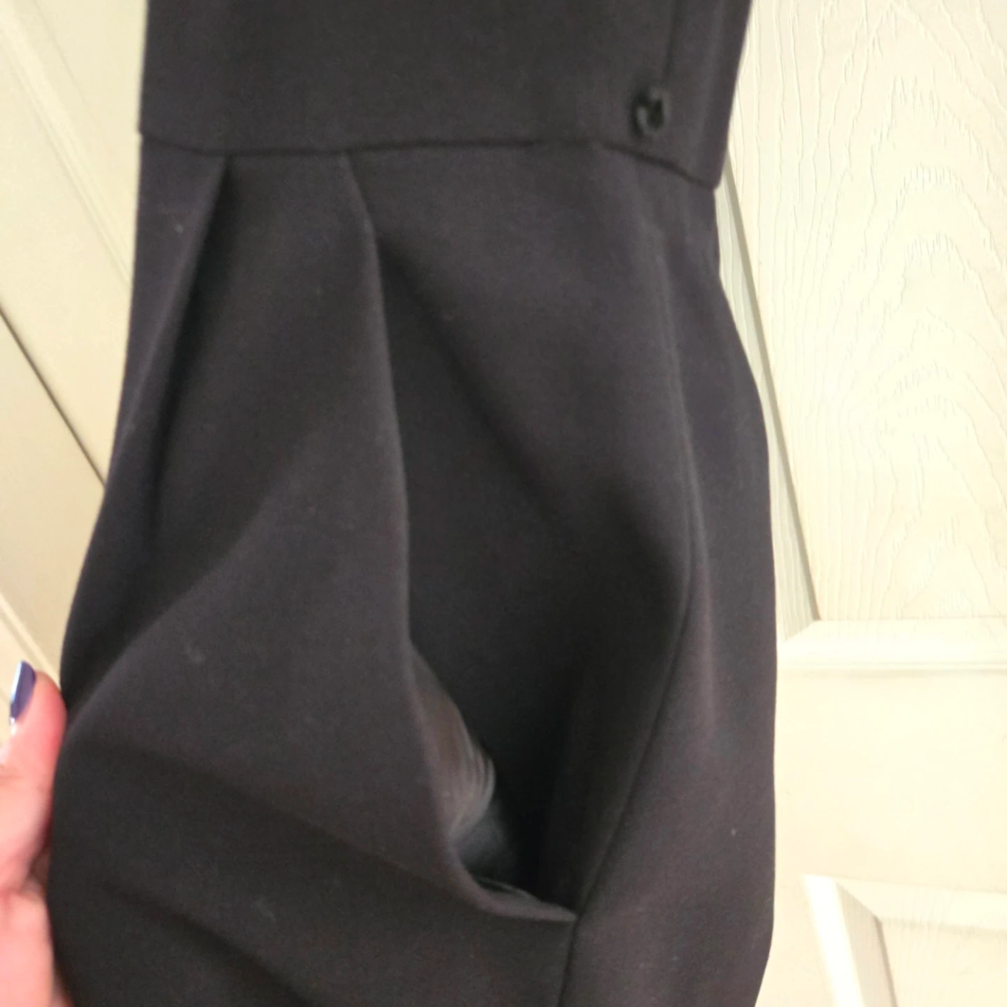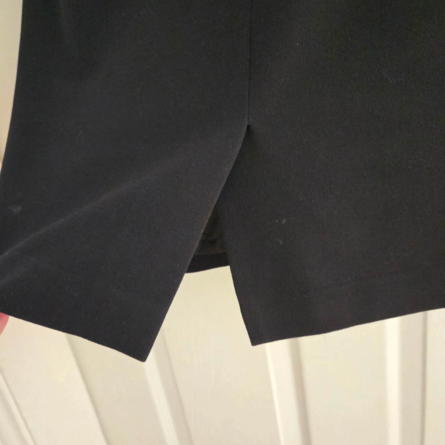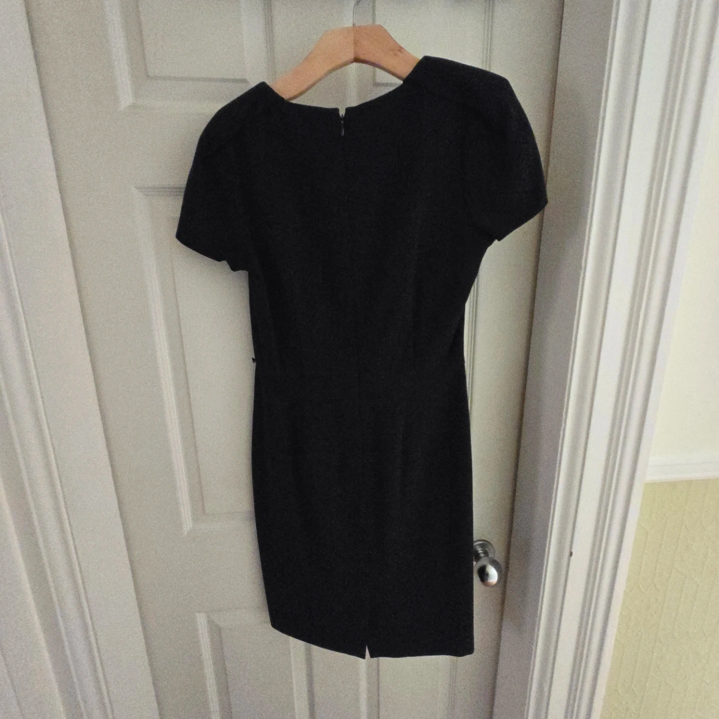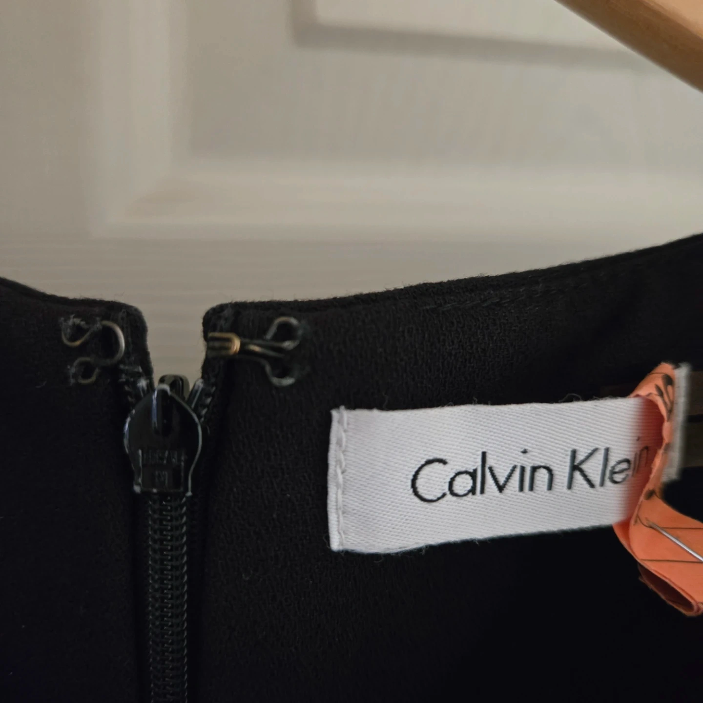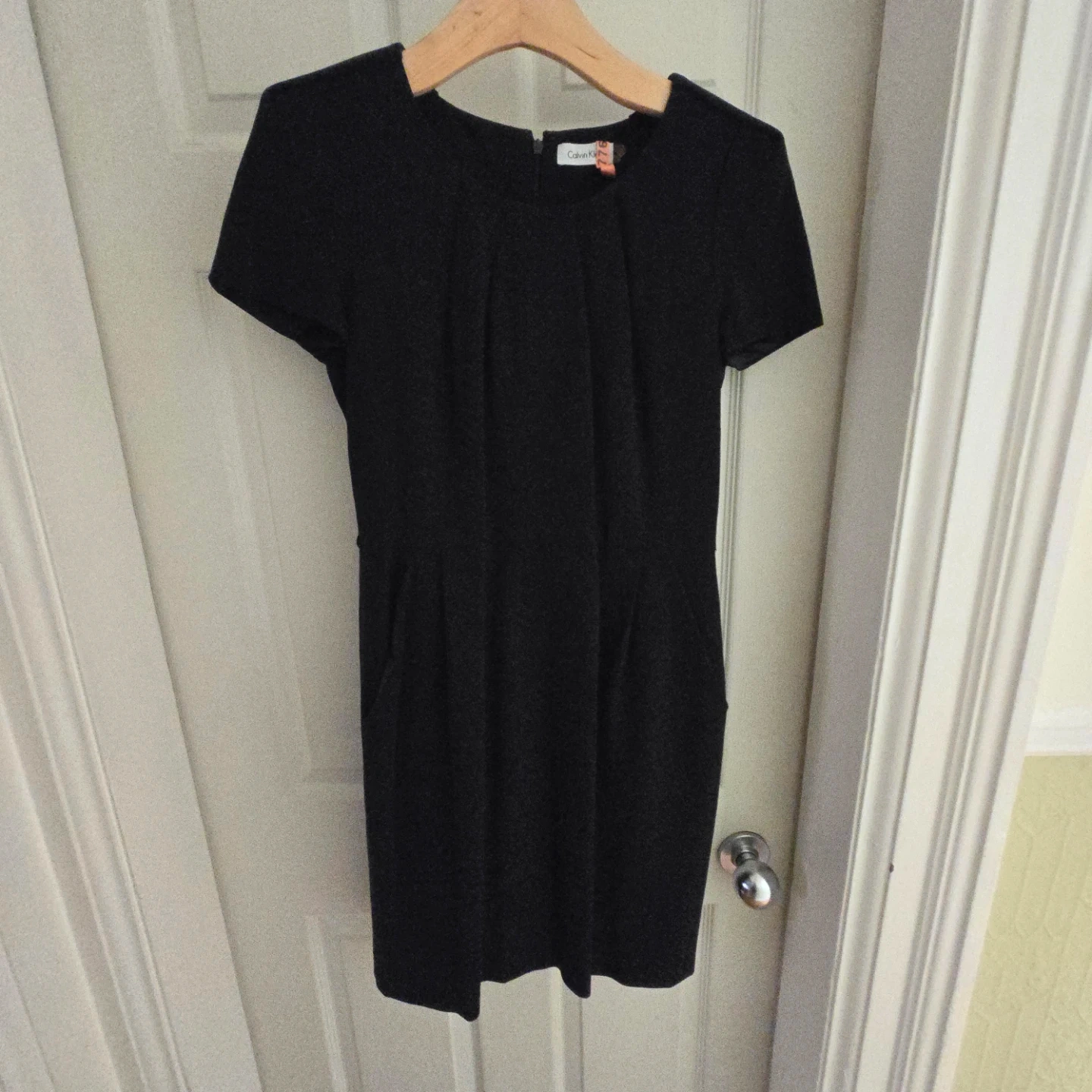 Black short-sleeve Calvin Klein dress. Features pleating details and two side pockets. A classic dress suitable for many occasions.
