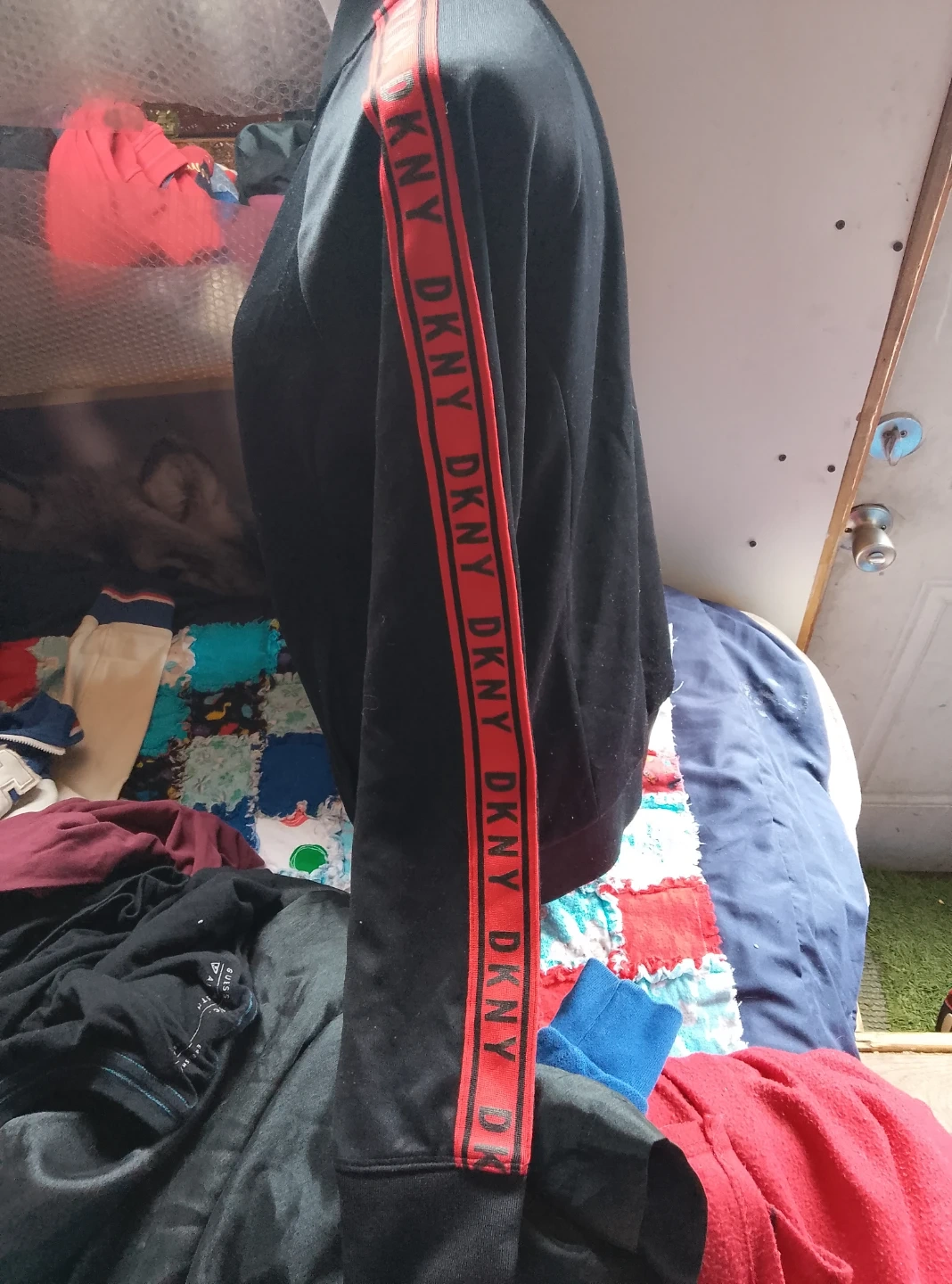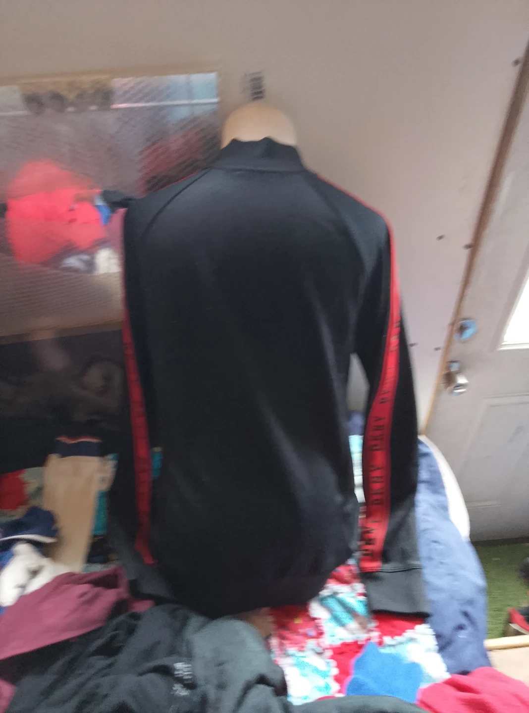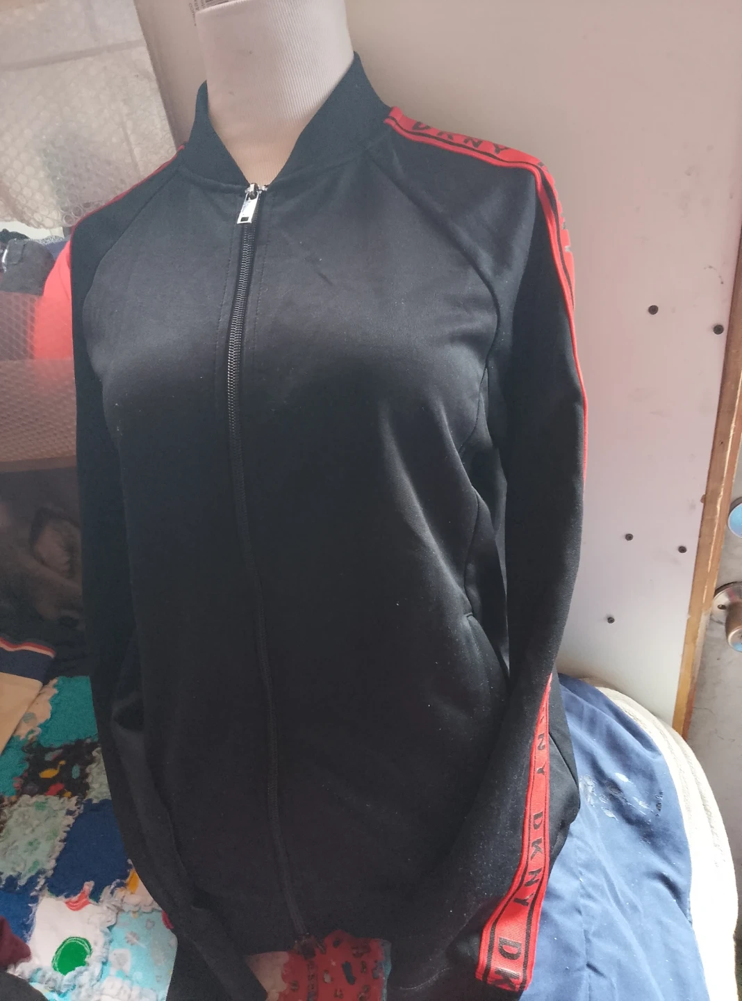 DKNY track jacket in black with red "DKNY" logo tape on the sleeves and shoulders. It's a full zip-up style with a stand-up collar. This jacket is great for casual wear or for athleisure looks. No rips or stains little ware as shown