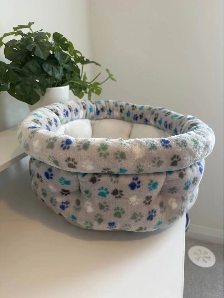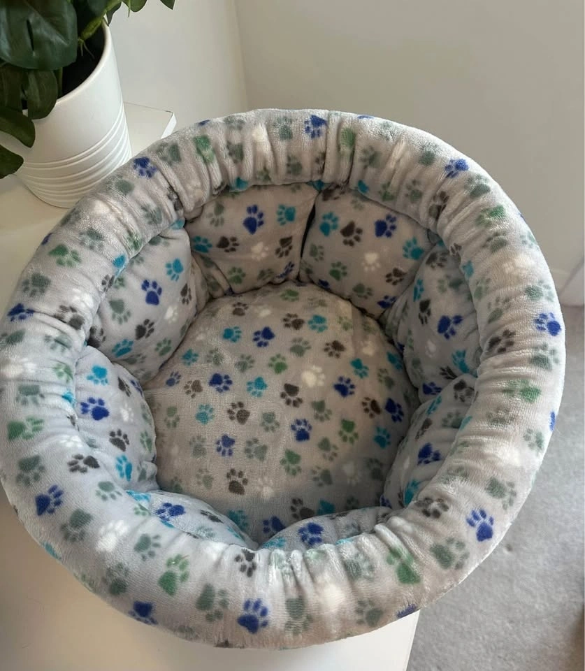 Owned for about a year, but never used. Bought for our kitten and he didn't like it. It's in just about perfect condition. Dimensions: height- 8.5", width & length- 16x16".