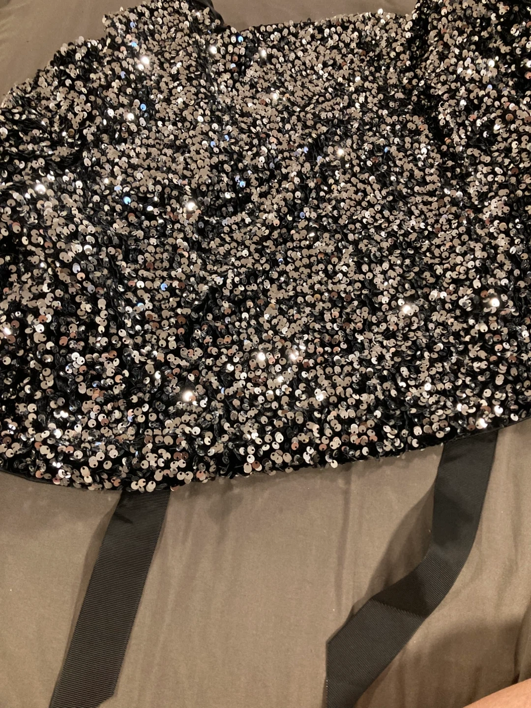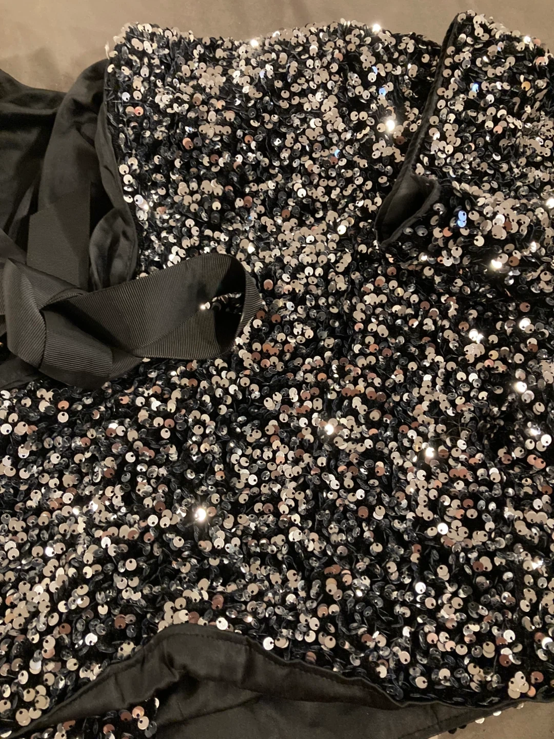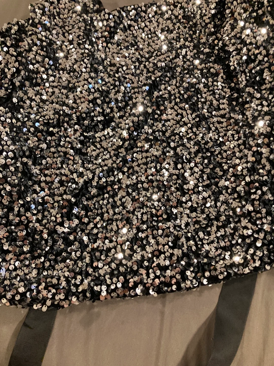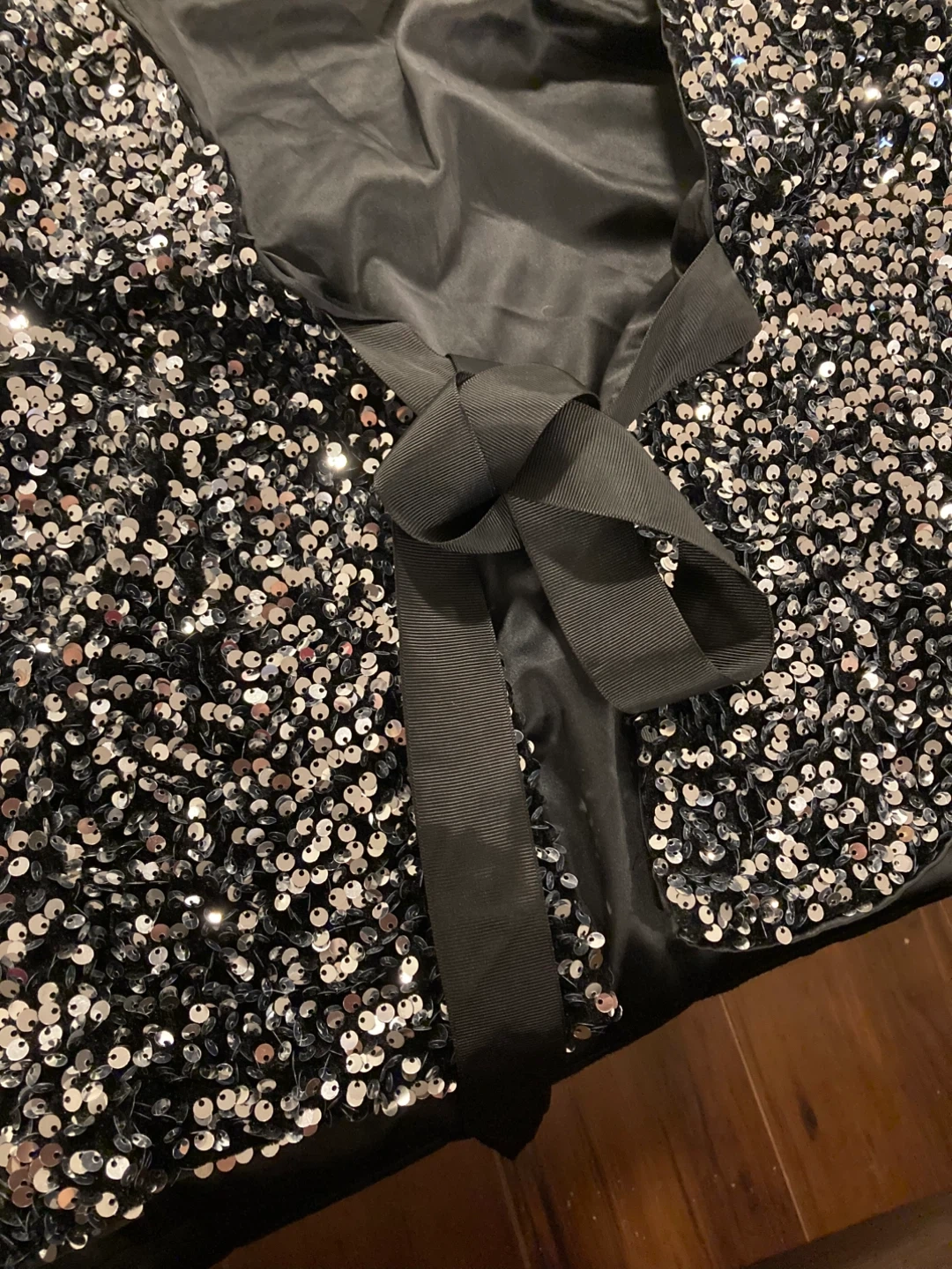 This sparkly Blazer is covered in shimmering sequins and features a chic black ribbon tie at the back. It's perfect for a night out or a special occasion!
