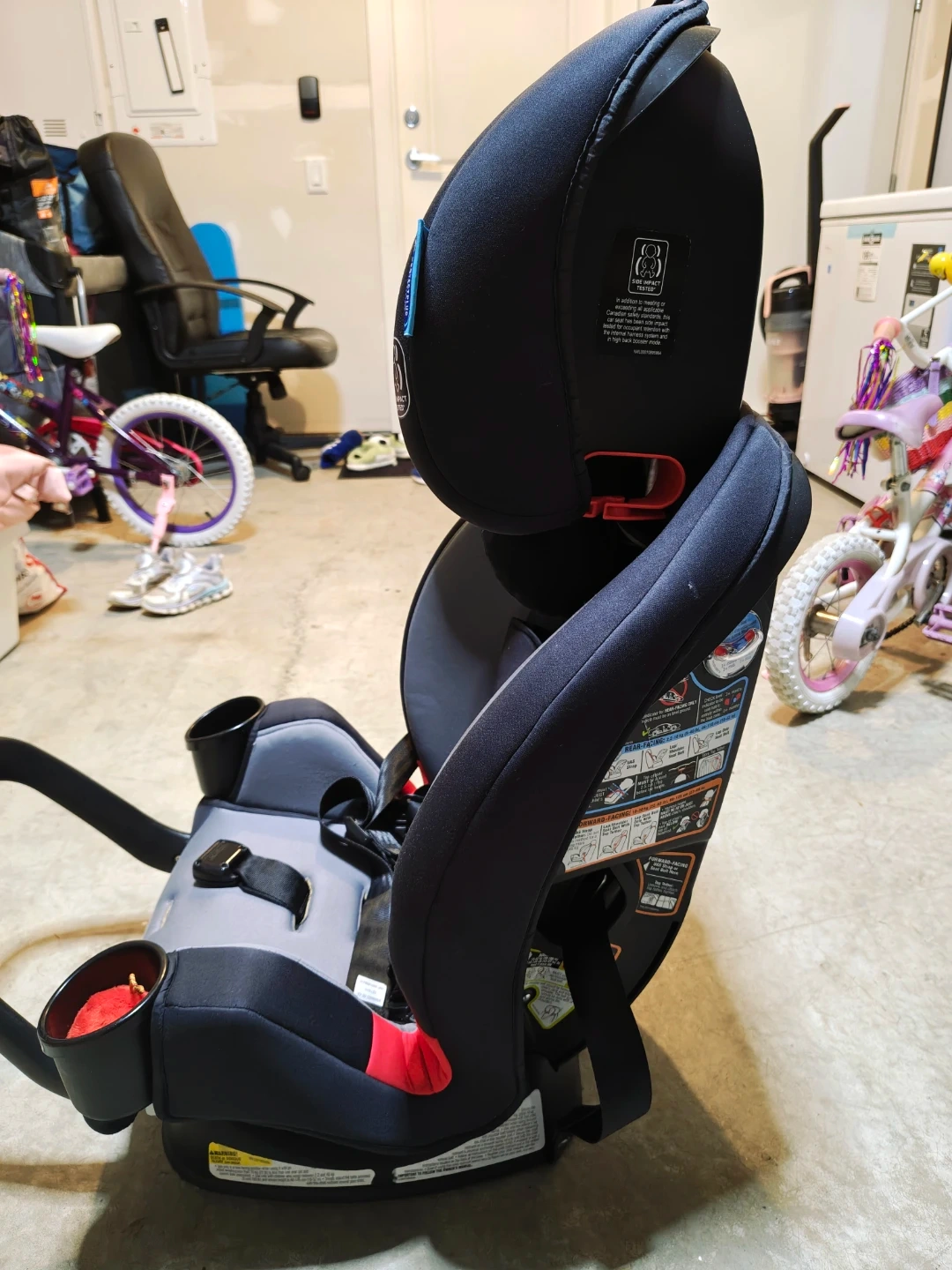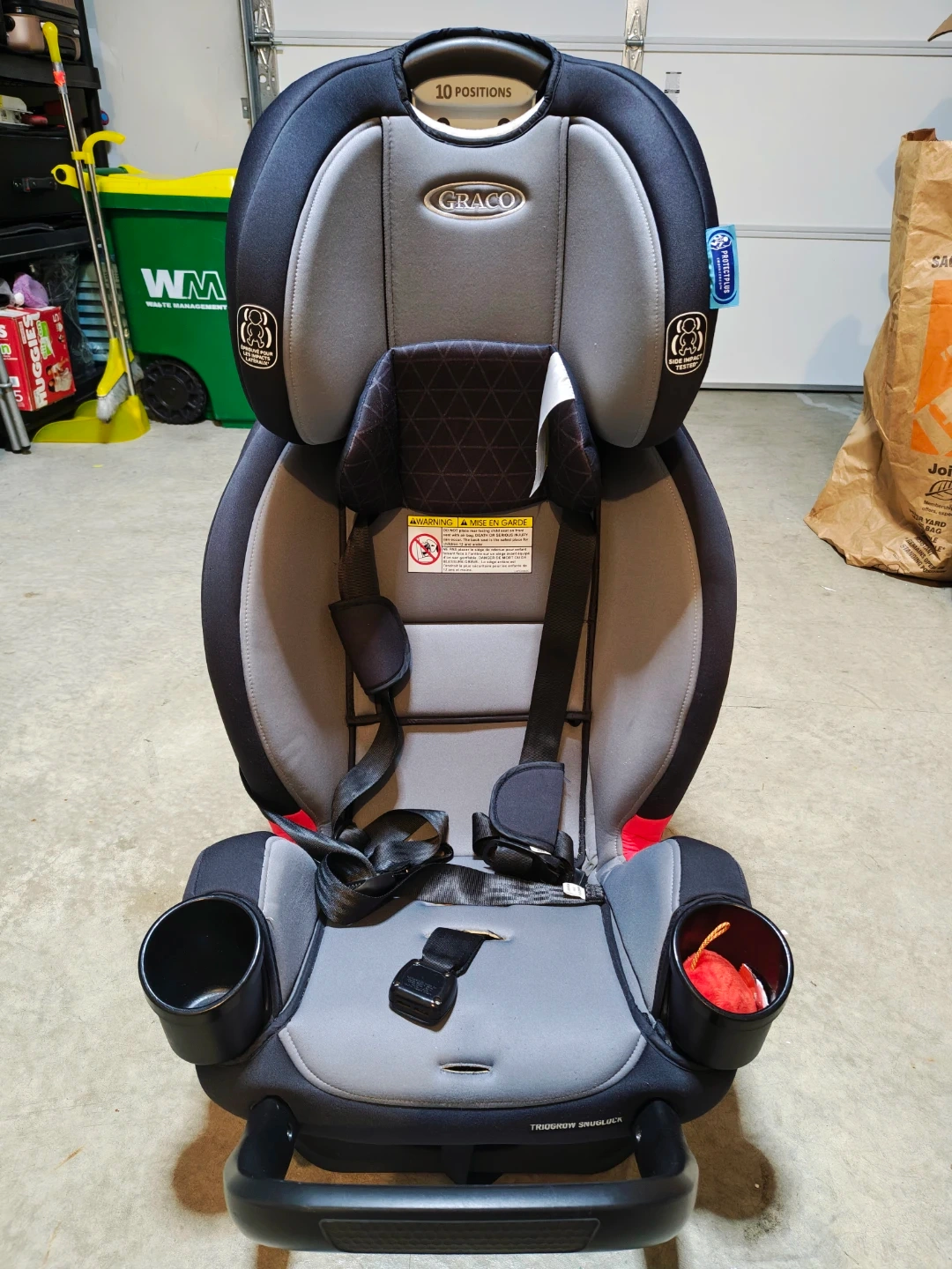 This Graco car seat is designed to grow with your child. It features a plush design with dual cup holders for convenience. The seat has 10 positions for adjustment.
