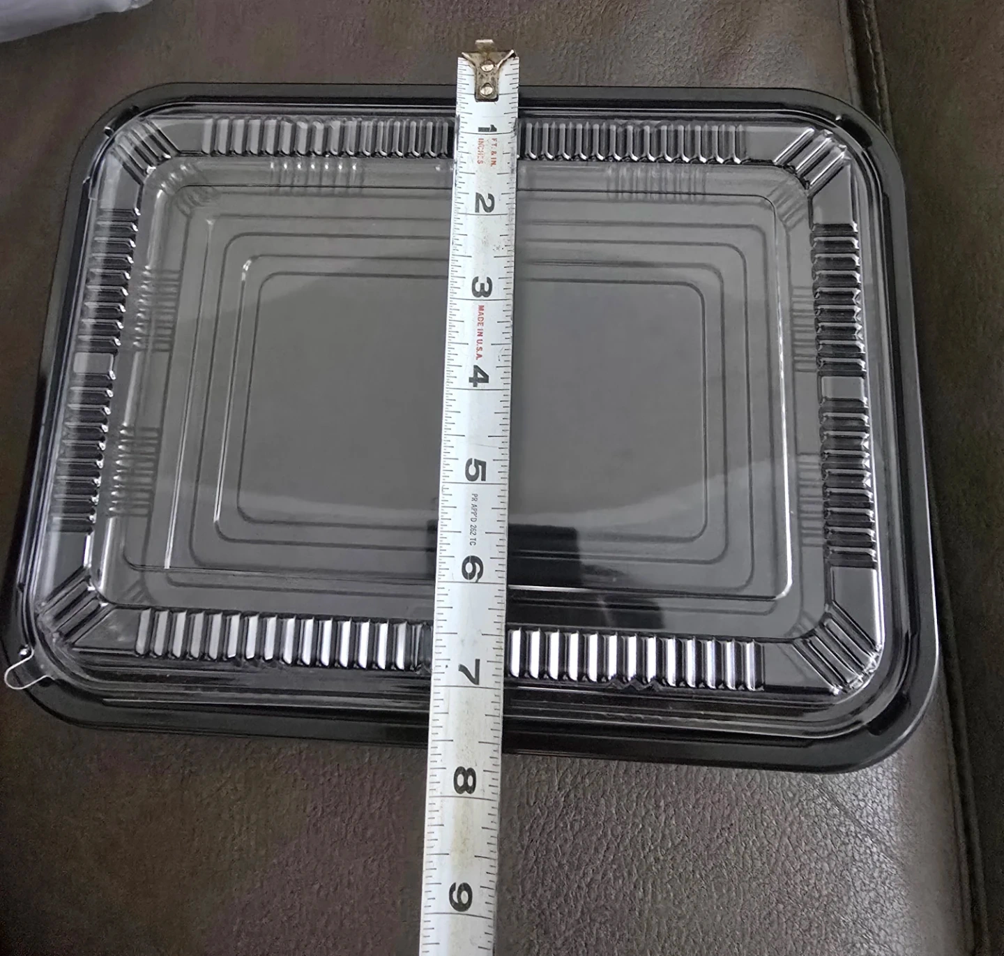 Rectangular black plastic container with a clear lid. It's approximately 7 inches long and 4 inches wide. This container is great for food storage or takeout.