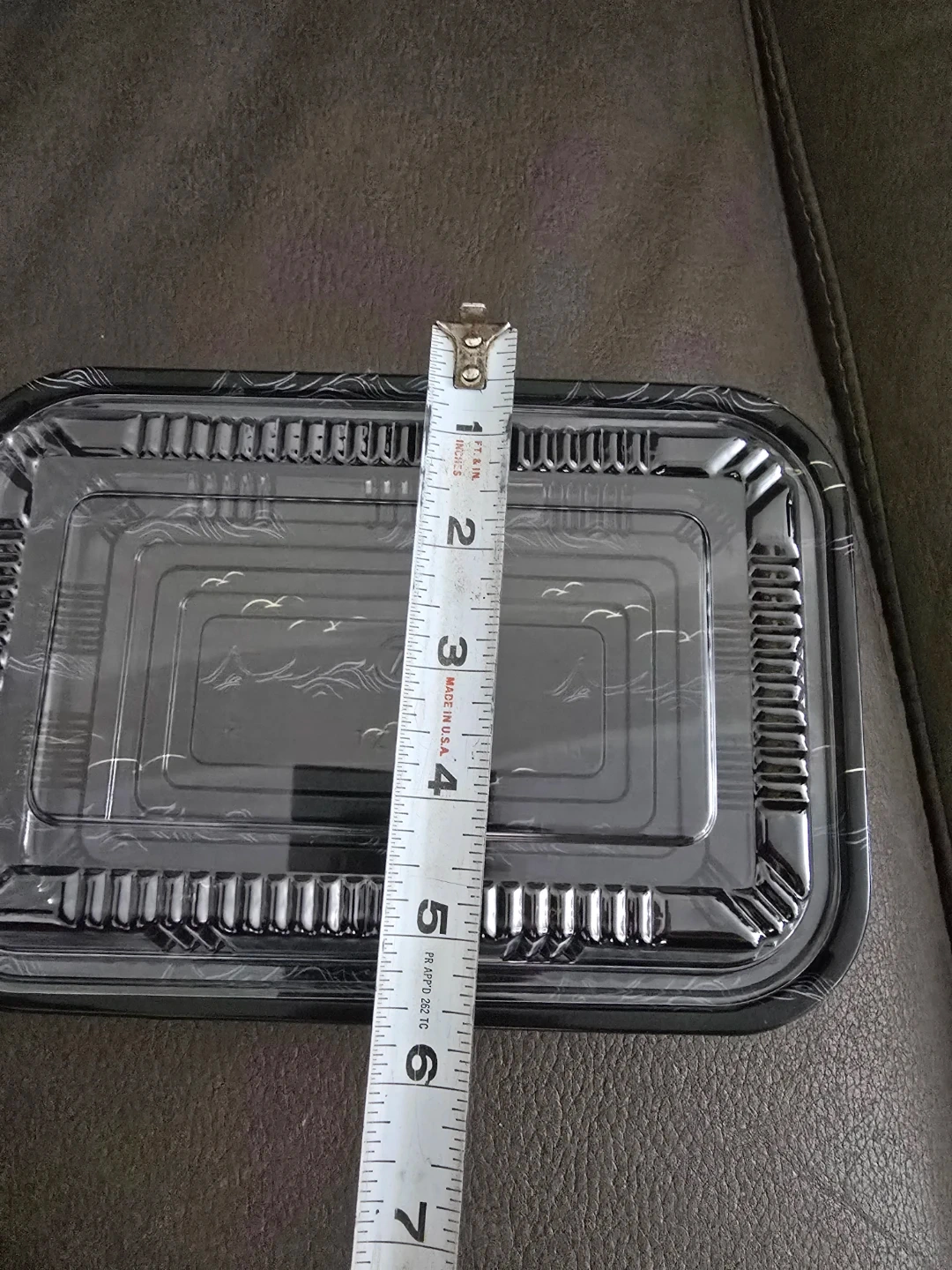 Rectangular black plastic container with a clear lid. It's approximately 7 inches long and 4 inches wide. This container is great for food storage or takeout.