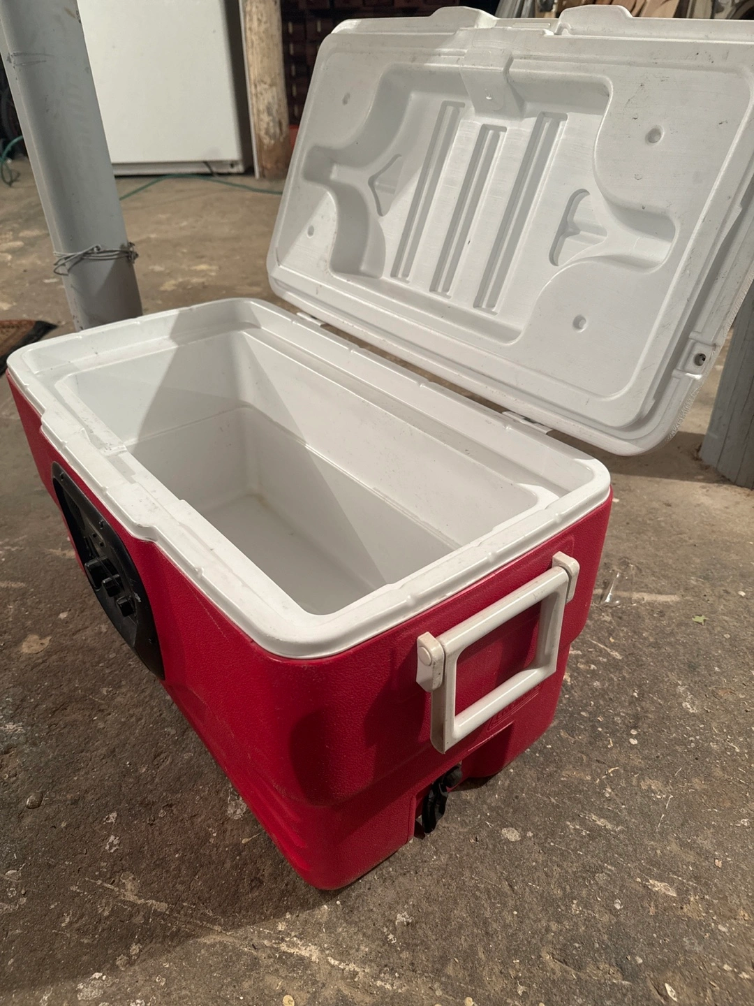 Red and white Coleman cooler with four cup holders on top. It has a built-in digital display speaker on the front. Great for parties and outdoor events!